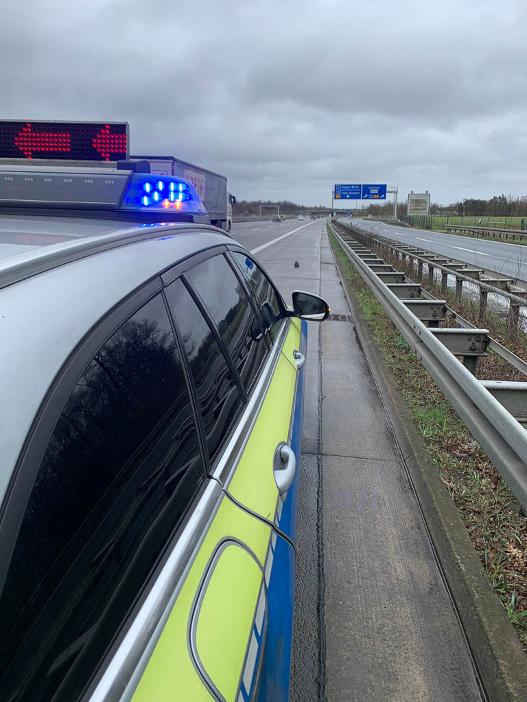 Ein Verkehrsteilnehmer meldete gegen 10:15 Uhr über Notruf einen Greifvogel, der auf dem Standstreifen der A7 zwischen Altwarmbüchen und Kirchhorst sitzen würde. Die eingesetzte Polizeistreife fand an besagtem Ort eine durchnässte und orientierungslose Eule, die auch beim Näherkommen nicht mehr wegfliegen oder -hüpfen konnte. Womöglich ist sie kurz zuvor mit einem fahrenden Auto oder LKW zusammengeprallt und wurde an Flügel und Schnabel verletzt.