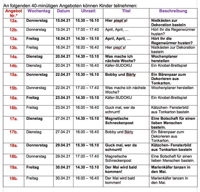 Für die Angebote im April können die Materialien ab Montag, 12.04. von 15.00 bis 18.00 Uhr, Dienstag, 13.04. und Mittwoch, 14.04. von 14.00 bis 18.00 Uhr und anschließend jeden Montag, Mittwoch und Freitag von 15.00 bis 18.00 Uhr in der Jugendfreizeitstätte Bückeburg, Jetenburger Straße 34, 31675 Bückeburg abgeholt werden.