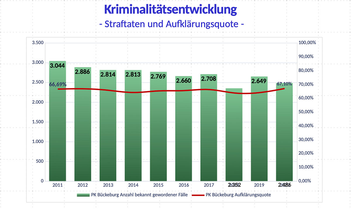 Die polizeiliche Aufklärungsquote ist laut Ralf Seland, Leiter des Kriminal- und Ermittlungsdienstes, auf 67,1 % gesteigert worden. Gegenüber 2019 (64,09 %) ein Anstieg von rund 3 % und „das beste Ergebnis in der Geschichte des Polizeikommissariats Bückeburg“, gibt Seland in einer Pressemitteilung zu Protokoll. Die Präsentation der Kriminalstatistik fand in diesem Jahr aufgrund der Corona-Pandemie auf digitalem Weg statt.