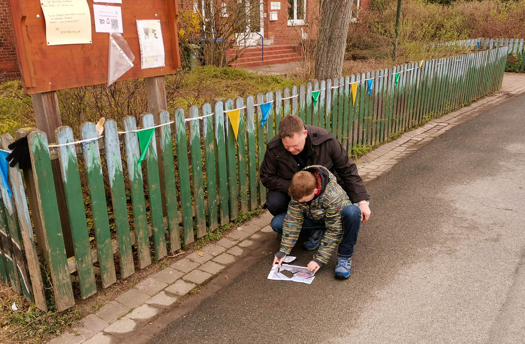 Bereits am gedeckten Frühstückstisch erhielten Kinder und Eltern die erste Aufgabe über die Handy-Gruppe der Kinderfeuerwehr und mussten diese für die weitere Suche lösen. Nachdem die Heimaufgabe gelöst war, machten sich die Teilnehmer einzeln auf den Weg zum Feuerwehrhaus, um dort im Außenbereich nach weiteren Hinweisen und Aufgaben zu suchen.