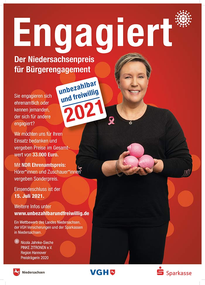 Die Bewerbung soll möglichst auf der Website www.unbezahlbarundfreiwillig.de eingestellt werden (alternativ schriftlich an Niedersächsische Staatskanzlei, „Unbezahlbar und freiwillig“, Planckstraße 2, 30169 Hannover). Einsendeschluss ist der 15. Juli 2021.