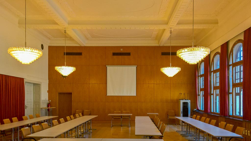 Die alten Kronleuchter wurden durch neue LED-Leuchtringe ersetzt, die im dezenten weiß gehalten sind. Diese „Kronleuchter 4.0“ seien zwar moderner als die vorherigen, würden sich aber am Charakter des Raumes orientieren und nicht etwas künstlich ‚historisieren’“, erklärt Marc Sigges weiter. „Durch die indirekte Beleuchtung nimmt man nun die Decke mit dem detailreichen Stuck viel besser wahr“.