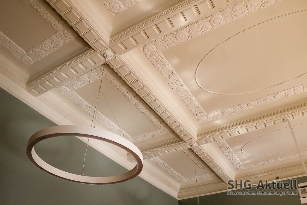Zahlreiche, durch die vergangene Renovierung in den 1970er Jahren verborgene Details, sind nun wieder sichtbar: Friese zwischen den Fenstern und auf der gegenüberliegenden Seite neben der nun wieder sichtbaren Durchreiche leuchten in strahlendem Weiß, während die Wandfarbe lindgrün samt der dunkelbraun angestrichenen Holzvertäfelung an den Jugendstil angelehnt ist, wie Björn Sassenberg, Fachgebietsleitung Planen und Bauen, und Marc Sigges, Gebäudemanagement der Stadt Bückeburg, erklären. „Leider wurde in der vorherigen Renovierung einiges zerstört, sodass beispielsweise das Fries zwischen der Durchreiche nicht mehr wiederherzustellen war“, so Sassenberg. Die Durchreiche selbst ist nun wieder sichtbar, vorher war diese durch einen roten Vorgang verdeckt.
