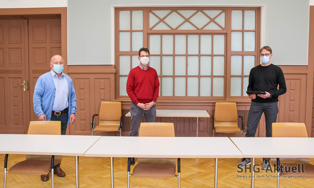 Außerdem wurde die neueste Technik im Raum verbaut: eine mobile Kamera, ein neues Mikrofon samt akustischen Verstärker, Säulenlautsprechern und großer Leinwand samt Beamer sorgen dafür, dass ab sofort alles auch digital funktioniert und Sitzungen auch in Hybridform stattfinden können. Die gesamte Technik, die Beleuchtung und Verdunklungselemente vor den Fenstern lassen sich zudem per Tablet steuern. „Hier hat sich die Firma sehr viel Mühe gegeben, die Kabel und alles an Technik so weit wie möglich zu verstecken“, lobt Sassenberg das Ergebnis. Die Bürgermeister-Galerie im Zuschauerbereich musste zugunsten eines Wandbildes mit dem Bückeburg-Wappen und einprägsamen Impressionen der Stadt weichen. „Für die Bürgermeister vergangener Zeiten finden wir schon ein anderes Plätzchen“, schmunzelt der amtierende Bürgermeister Brombach.