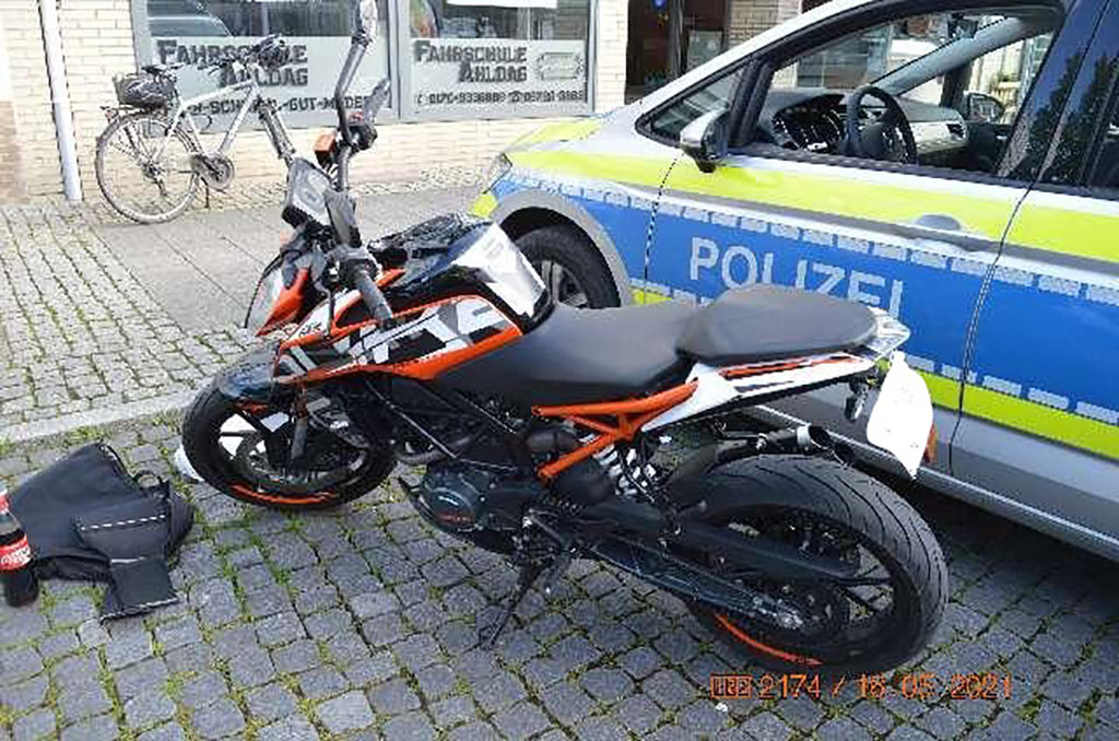 Der Nutzer des Krades, ein 16-jähriger Jugendlicher aus dem Auetal, der den Unfall von der gegenüberliegenden Straßenseite beobachten konnte, richtete gemeinsam mit dem Verursacher das Motorrad wieder, der anschließend mit seinem Transporter wegfuhr, ohne seine Personalien zu hinterlassen.