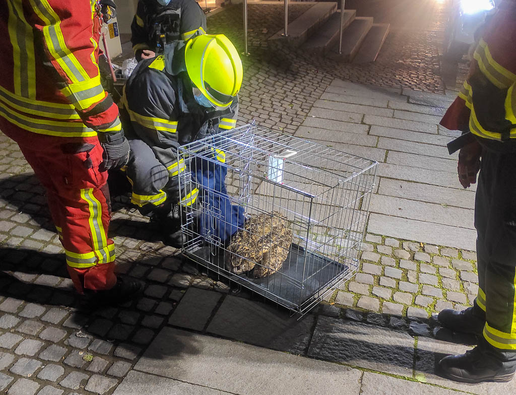 In der kleinen Gasse zwischen den Hausnummern 17 und 18 der Langen Straße befand sich eine Eule, die sich nicht mehr von selbst aus ihrer misslichen Lage befreien konnte.