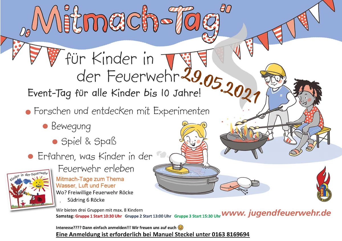 Interessierte Kinder können sich gerne über den Kinderfeuerwehrwart Manuel Steckel telefonisch unter 0163 / 8169694 oder unter www.feuerwehr-roecke.de für den Tag anmelden.