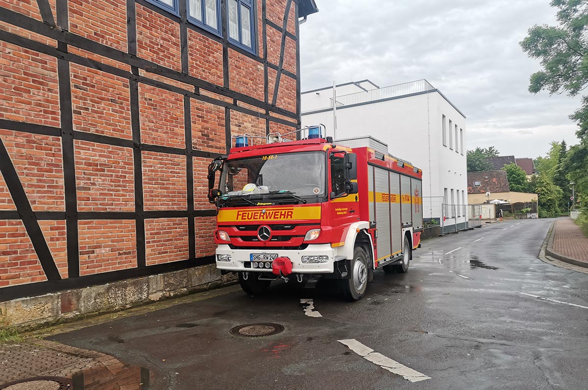 Vor Ort war ein in Bau befindliches Dachgeschoss provisorisch von Arbeitern abgedeckt worden, leider regnete es dennoch hinein und so wurde die Feuerwehr um Hilfe gebeten. Währenddessen konnte das Dach gesichert werden und ein weiterer Einsatz der Ortsfeuerwehr war nicht vonnöten.
