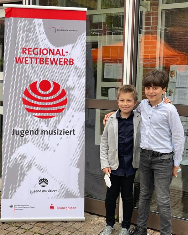 Auch in der Kategorie Duo (Klavier und ein Streichinstrument) konnte der Geigenschüler Johannes Kroeck mit seinem Bruder Lennard beim Regionalwettbewerb in Syke die zweithöchste Punktzahl erreichen. Der Geigenlehrer Leonardo Calla freute sich über 24 von 25 Punkten sehr. Lennard nimmt privat Klavierunterricht und ergänzte auf nahezu vollkommene Weise das Geigenspiel seines Bruders.