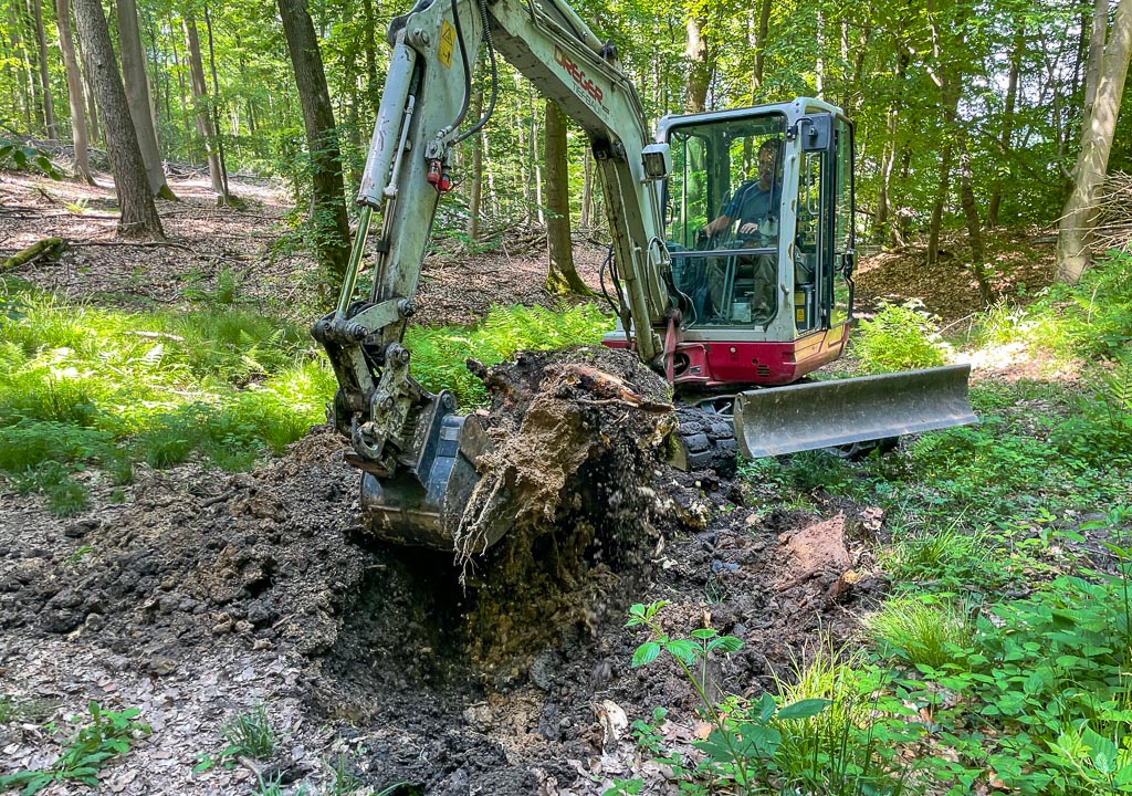 Besonders erfreut zeigte sich der Vorsitzende Georg Völkel über die zugesagte Unterstützung der Firma Uwe Drinkuth aus Bückeburg, der mit seinem Mitarbeiter, Maximilian Ovesiek, einen störenden Baumstumpf kostenfrei entfernte, um somit für die Ortsvereinigung Bergdorf, unter Leitung von Gerd Vogel, den Weg freizumachen, die neuen Sitzgelegenheiten aufstellen zu können. Im Vorfeld hatte die Hofkammer schon einiges an Holz bewegt und den Grundstein für weitere Maßnahmen geebnet.