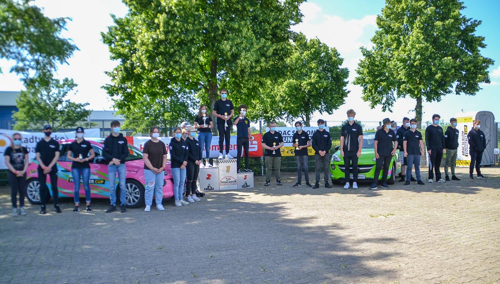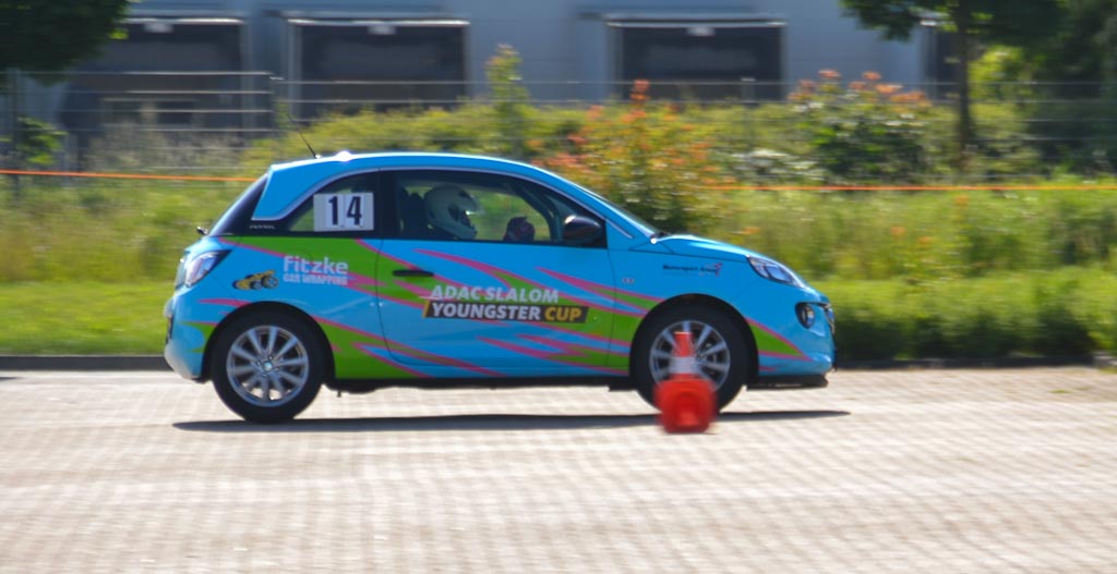 Zuschauer waren auch nicht zugelassen, aber mancher Fahrradfahrer verweilte etwas auf dem großen Bürgersteig, um am Renngeschehen teilhaben zu können. Bevor in das Auto gestiegen werden konnte, wurde mit Abstand und Maske genauestens die Streckenführung begutachtet. Dann ging es in ausgeloster Reihenfolge endlich in die Autos. Neu farbenfroh gestaltet warteten die 90 PS starken Opel Adams, die der ADAC Niedersachsen/Sachsen-Anhalt dafür den Fahrern stellt und für den Slalomsport sicher umgerüstet sind. Gefahren werden eine Trainingsrunde und zwei Wertungsrunden.