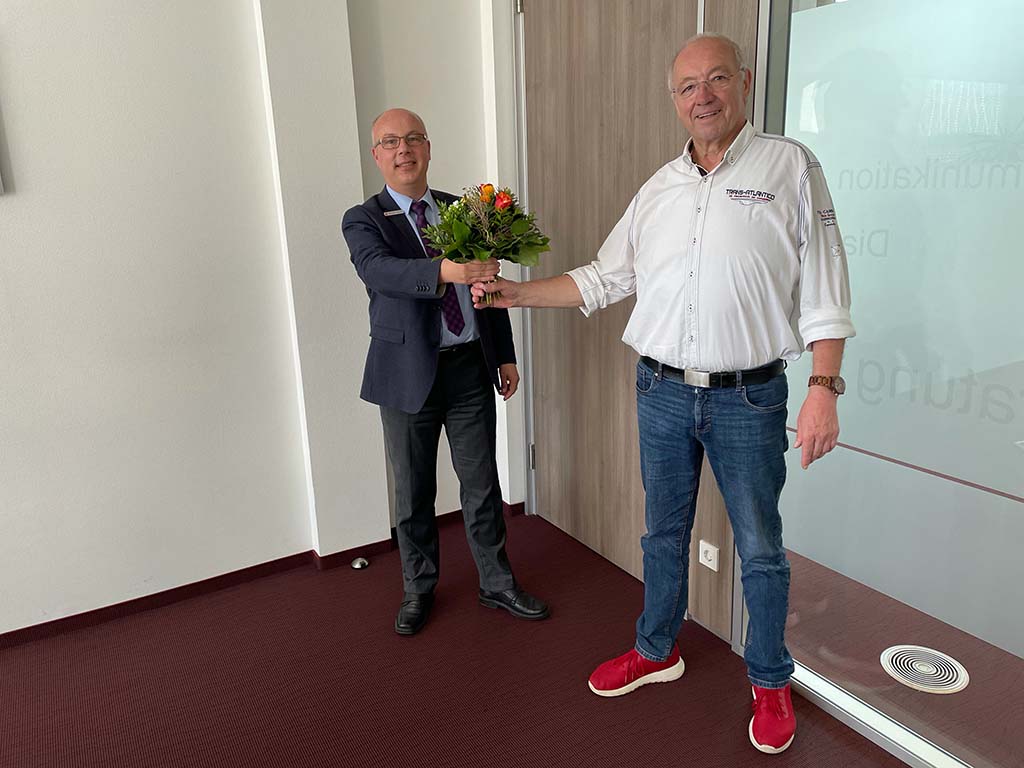Mit Blumenstrauß und Gewinnzertifikat fand die Übergabe, coronagerecht mit Abstand, statt.