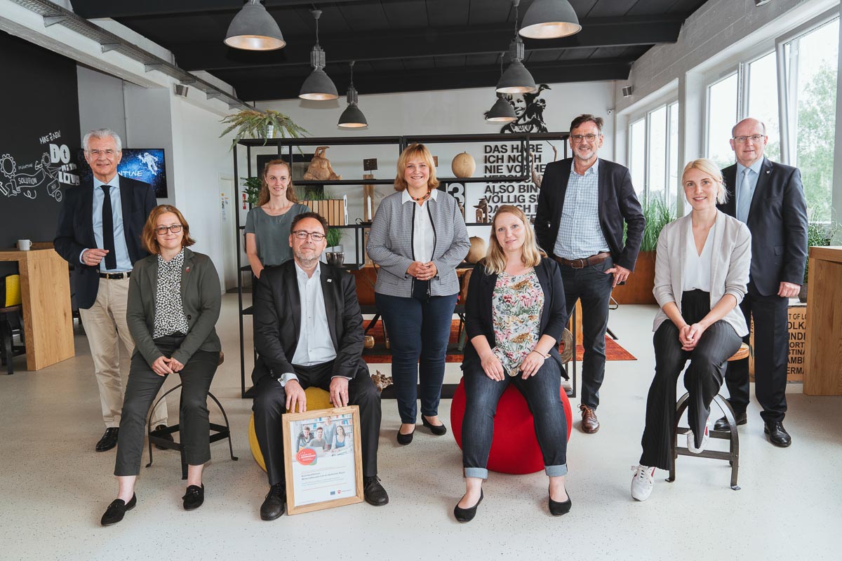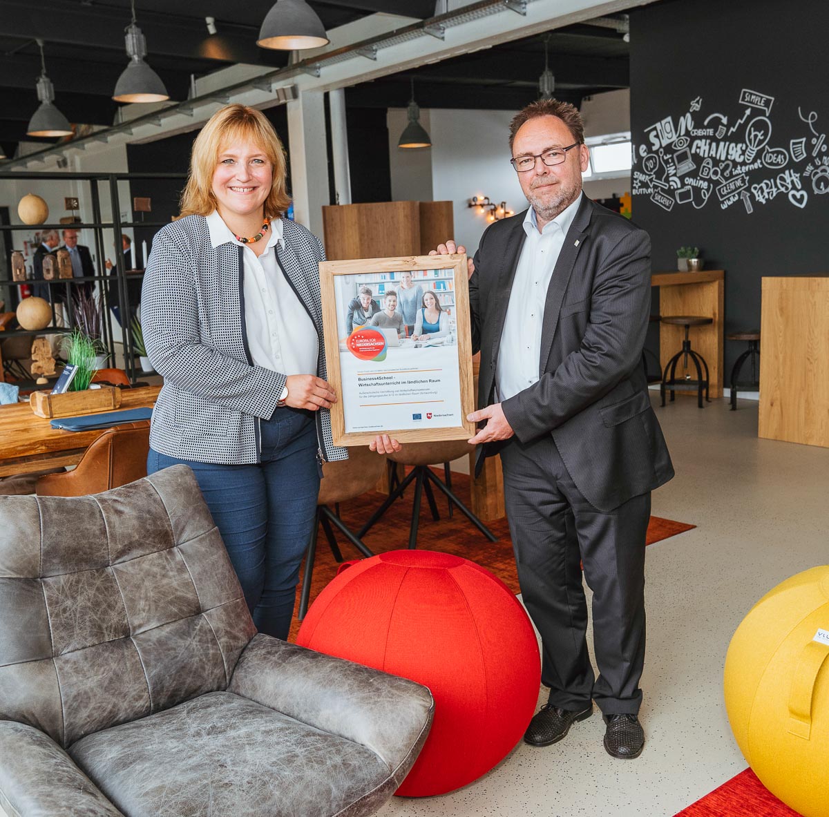 (Stadthagen) Während ihrer Sommerreise machte Dinah Stollwerck-Bauer, Landesbeauftragte für regionale Landesentwicklung Leine-Weser, Station in Stadthagen. Heute überreichte sie in der iKantine einen Förderbescheid mit einem Zuwendungsvolumen von 44.853,97 Euro an Thomas Kexel, Vorstand der Weserbergland AG für das Projekt „Business4School“. An der Übergabe im Coworking Space nahmen neben weiteren Vertretern der Weserbergland AG außerdem politische Vertreter und Wirtschaftsförderer der Städte Bückeburg, Rinteln und Stadthagen sowie der Projektinitiator von Business4School, Ulrich Herfurth, und der Landrat von Schaumburg, Jörg Farr, teil.