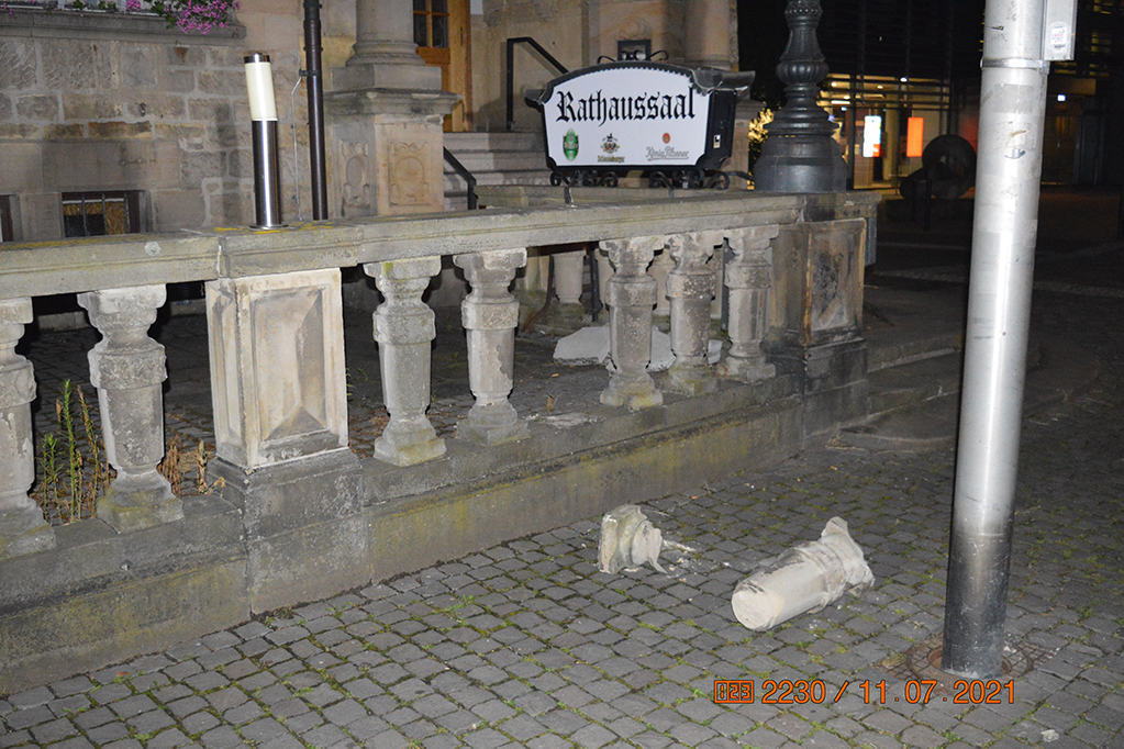 (Bückeburg) Vor dem Bückeburger Rathaus am Marktplatz ist in der Nacht von Samstag auf Sonntag eine massive, 60 Zentimeter hohe Steinsäule aus der Steinbrüstung herausgebrochen und zerstört worden.