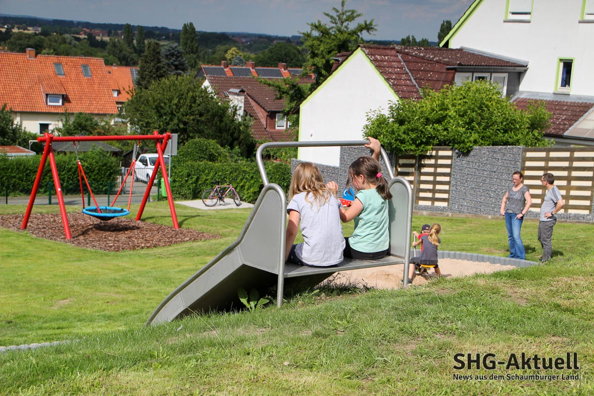 Doch für die Kinder sind natürlich die Spielgeräte das Wichtigste, und diese können sich ebenfalls sehen lassen. Hoch frequentiert waren am ersten Tag bereits die Rutschanlage sowie das Klettergerüst „Koloss“, dass Balance und Koordination der Kinder spielend schult. Danach geht es für eine kurze Rast gerne in die Hängematten, die lässig schaukeln und gemütlich daherkommen. En Reck animiert zu sportlicher Betätigung, zusätzlich sorgen Schaukel, Wipptier, Sandkasten und Bagger für viel Unterhaltung und Spaß. „Alle waren an den Planungen beteiligt, auch Kinder waren damals beim Ortstermin mit dabei. Das war gutes Teamwork“, bestätigt auch Sandra Schauer aus der Arbeitsgruppe Spielplätze. Für die Eltern sorgt eine Ruhebank mit Tisch und eine Fahrrad- und Kinderwagenstellplatz für Komfort.