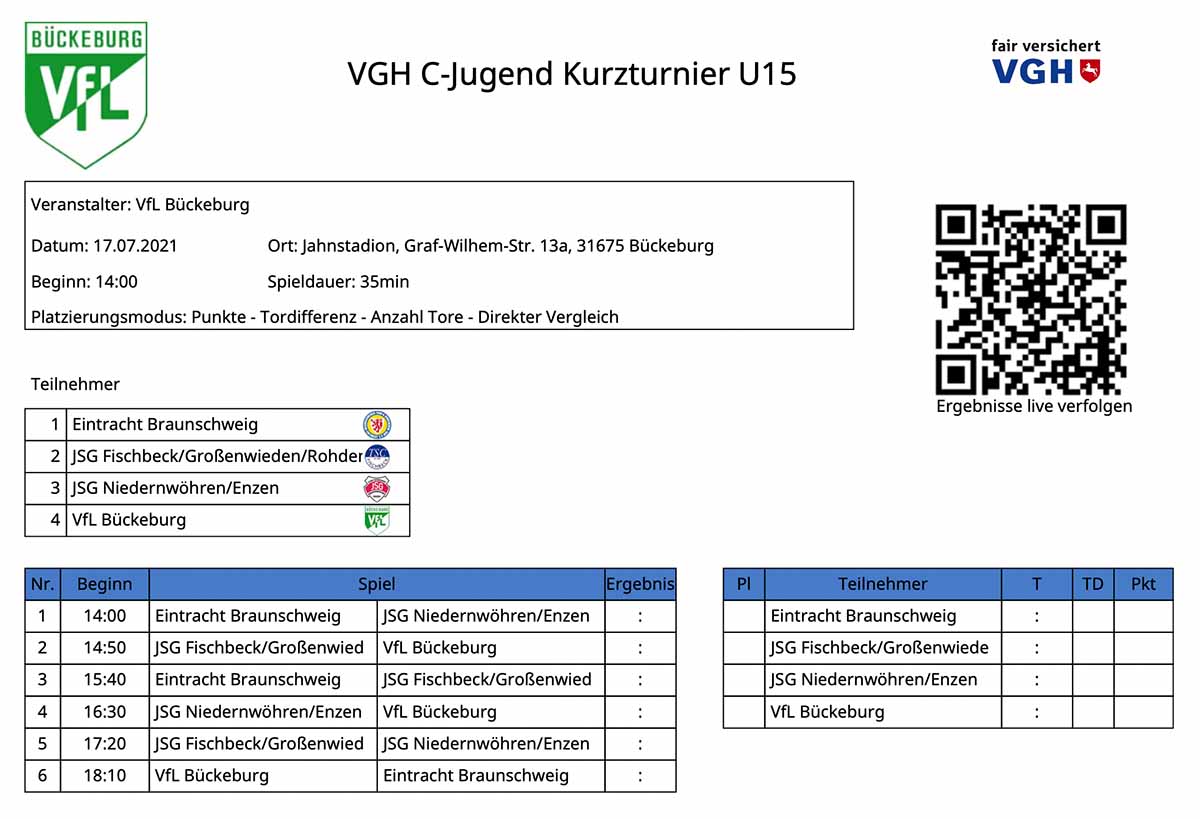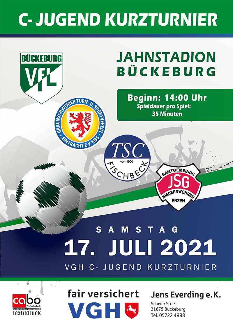 (Bückeburg) Die Jugendfussballabteilung des VfL Bückeburg veranstaltet am kommenden Samstag ab 14:00 Uhr ein VGH C-Jugend Kurzturnier mit Mannschaften aus Schaumburg (JSG Niedernwöhren/Enzen u. VfL Bückeburg) und Hameln/Pyrmont (JSG Fischbeck/Großenwieden/Rohden).
