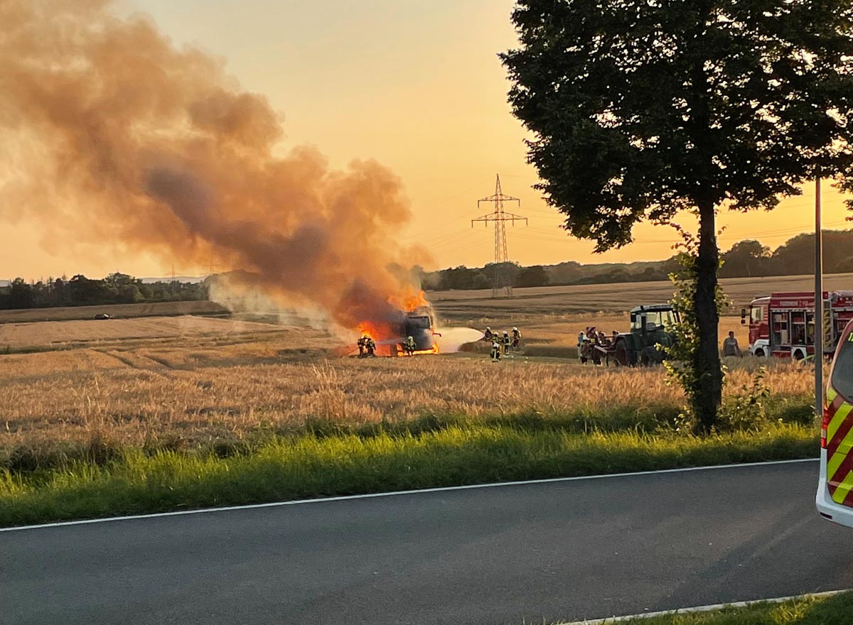 Bei einem Mähdrescher, der gerade erst mit den Arbeiten gestartet war, brach ein Feuer aus. Bei Eintreffen der Feuerwehr brannte das landwirtschaftliche Gerät in voller Ausdehnung. Sieben Einsatztrupps unter Atemschutz löschten die Flammen mit zwei C-Rohren und einem B-Rohr. Ein Schaumrohr wurde vorbereitet, musste aber nicht mehr zum Einsatz kommen. Die Wasserversorgung wurde durch drei Tanklöschfahrzeuge und zusätzlich durch Unterflurhydranten von der Straße aus sichergestellt.