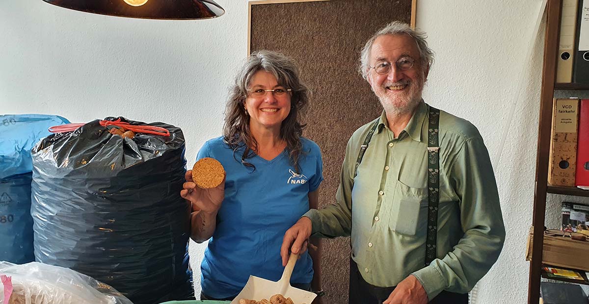 Die erneute Lieferung erneuerte nun die Kooperation zwischen dem Umweltzentrum und dem NABU. Diese Korken stammen im Wesentlichen aus Schaumburg, denn hier sammelt der NABU Stadthagen seit über 20 Jahren Naturkorken. Natürlich sind auch alle anderen NABU Gruppen im Weserbergland beteiligt – die meisten geben Ihre Korken dann in der Regionalgeschäftsstelle Weserbergland ab. „Herr Walz rief mich an und bat mich dringend um die hier gesammelten Korken“ erzählt die Leiterin der Geschäftsstelle, Britta Raabe.