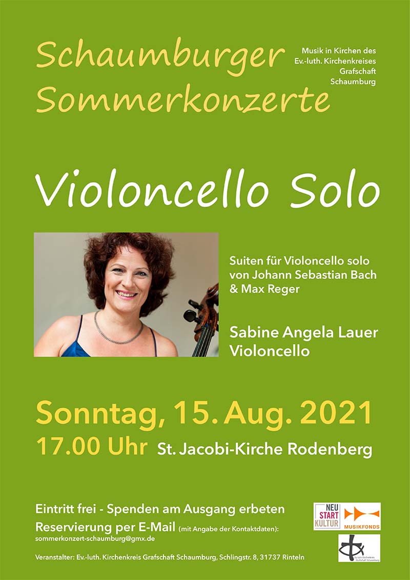 (Rodenberg) Am Sonntag, 15. August findet um 17 Uhr ein „Schaumburger Sommerkonzert“ in der St. Jacobi-Kirche in Rodenberg statt. Die Cellistin Sabine Angela Lauer präsentiert ein Programm mit Werken für Violoncello solo von Johann Sebastian Bach und Max Reger.