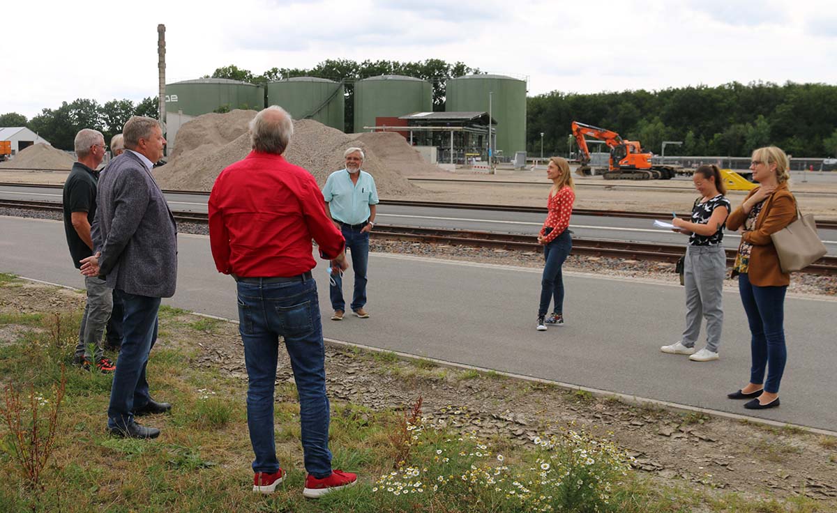 Reiner Wilharm, Geschäftsführer der Hafen Bückeburg-Berenbusch GmbH, begrüßte Völlers, Schauer und weitere Gäste des SPD-Ortsvereins Evesen am Eingang des Hafens. Er berichtete, dass inzwischen die zweite Ausbaustufe der Erneuerung der Gleisanlage im Hafen erreicht sei, welche in großen Teilen durch Förderungen getragen würde.