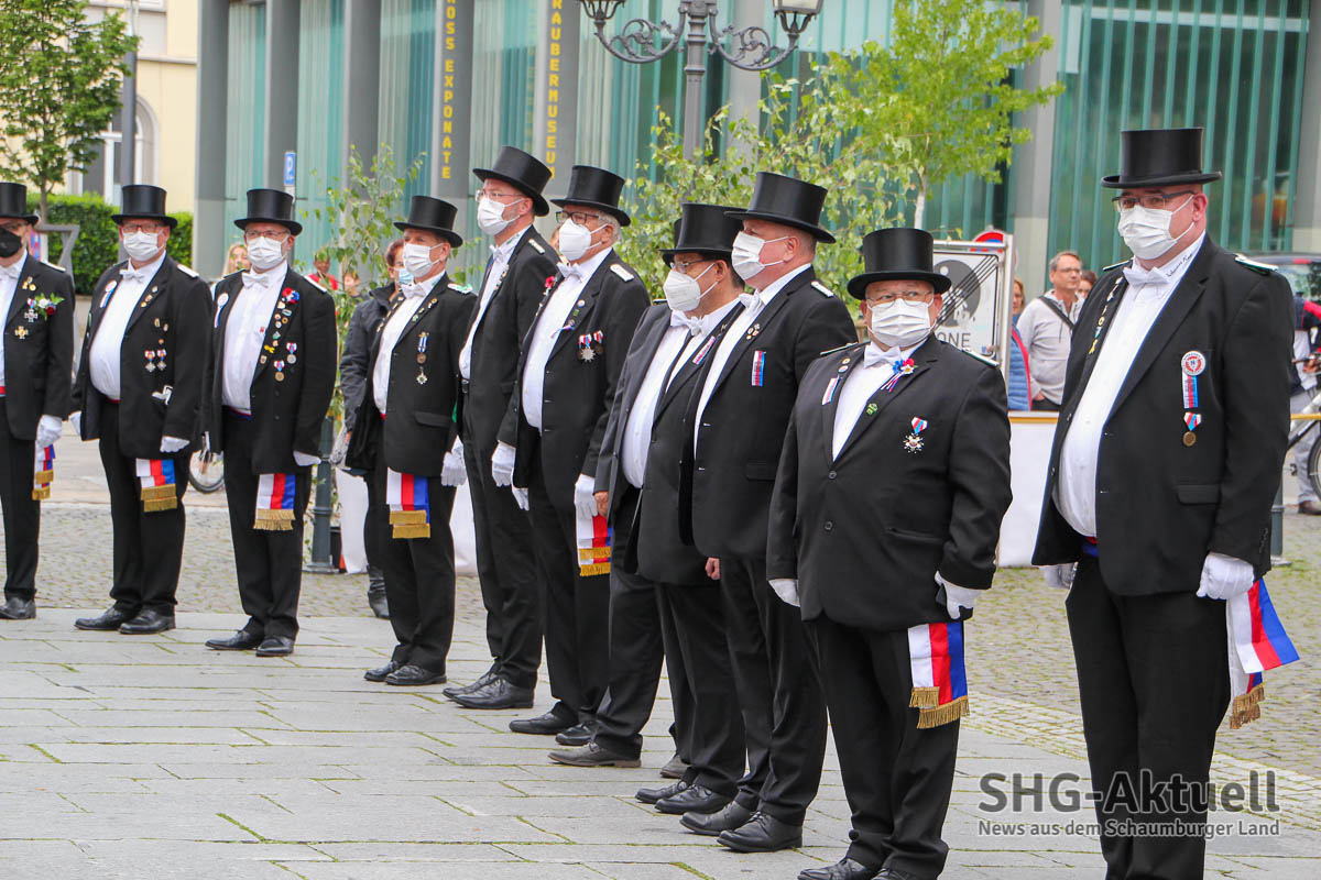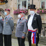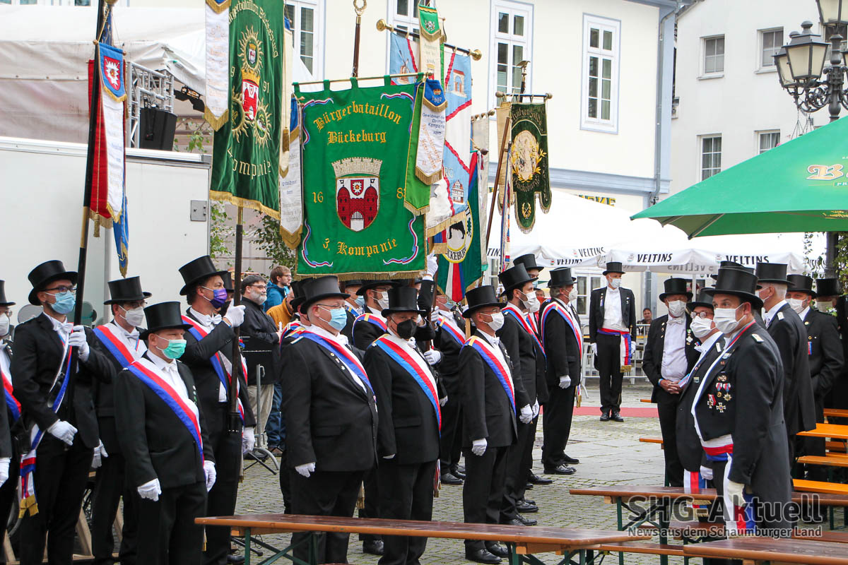 (Bückeburg) Dass dieses Bürgerfest, wenn auch in abgespeckter Form, stattfinden kann, ist eine große Freude – nicht nur bei den Mitgliedern des Bürgerbataillons, die sich in Frack und Zylinder geschmissen hatten, sondern auch für die zahlreichen Bückeburger Bürger, die pünktlich zum Fahnenausmarsch und Gottesdienst auf dem Marktplatz erschienen waren.