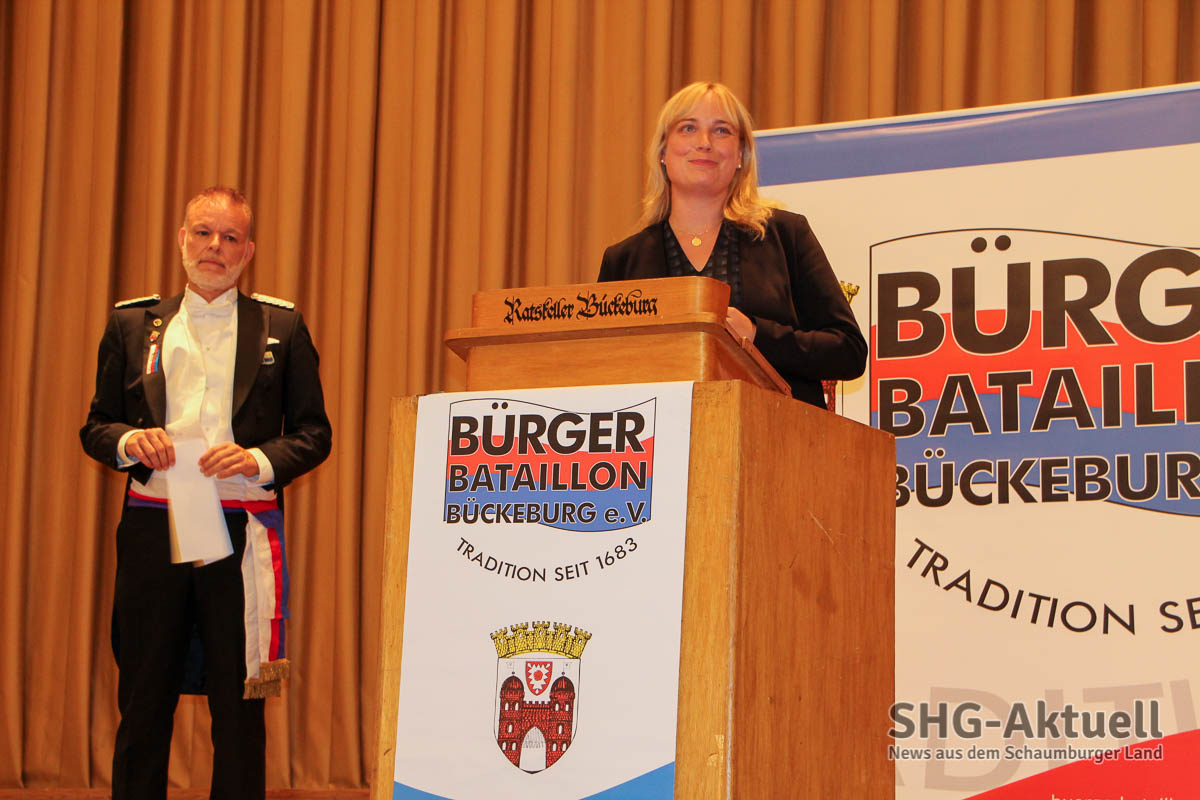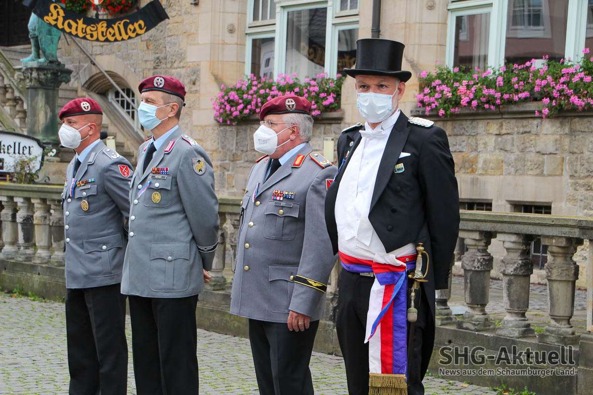 SPD-Bundestagsabgeordnete Marja-Liisa Völlers richtete ebenfalls Grußworte an die Anwesenden: „Auch uns Politikern fehlen die Volksfeste. Schön zu sehen, dass, wenn sich alle an die Regeln halten, auch Traditionen gepflegt werden können. Pflegen Sie weiter die Kameradschaft!“. „Dieses Bürgerschießen machen zu können, ist ein Gewinn. Danke dafür, dass sie weiter zum Bürgerbataillon stehen“, fügte Alexander Fürst zu Schaumburg-Lippe hinzu. Brigadegeneral Ulrich Ott überbrachte die Grüße der Soldaten und hatte zwei passende Zitate zur Veranstaltung und für die Veranstalter im Gepäck: „Zwei Sprüche bei der Bundeswehr haben mich geprägt: ‚Im Krieg hat nur das Einfache Erfolg‘, daher ist es sehr gut, dass auch dieses Fest in diesem Jahr einfach gehalten wird. Und: ‚Wer nicht wagt, der nicht gewinnt‘, und ihr sendet mit eurem heutigen Wagnis ein gutes Signal nach außen“.