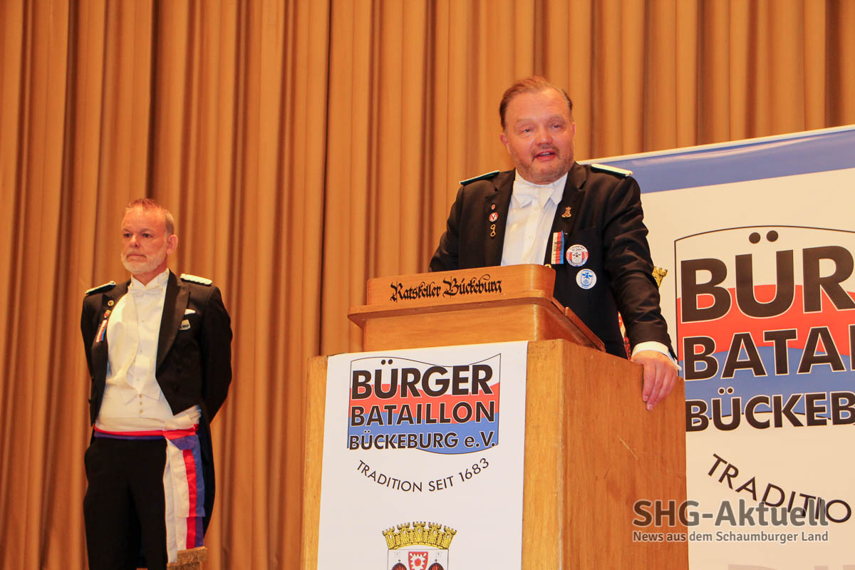 „Niemand hätt’s geglaubt, aber das Bürgerbataillon ist zu allem in der Lage. Daher ist es eine große Freude, dass wir heute gemeinsam feiern dürfen“, sprach Bürgermeister Reiner Brombach einleitend zur Versammlung. „Das Bürgerbataillon ist eine tragende Säule für unsere Gesellschaft, das werden wir in den nächsten drei Tagen wieder beweisen. Wir fördern das Zusammensein von Menschen und das gesellschaftliche Leben“, so der Verwaltungschef weiter, bevor er das Wort an Stadtmajor Martin Brandt übergab.