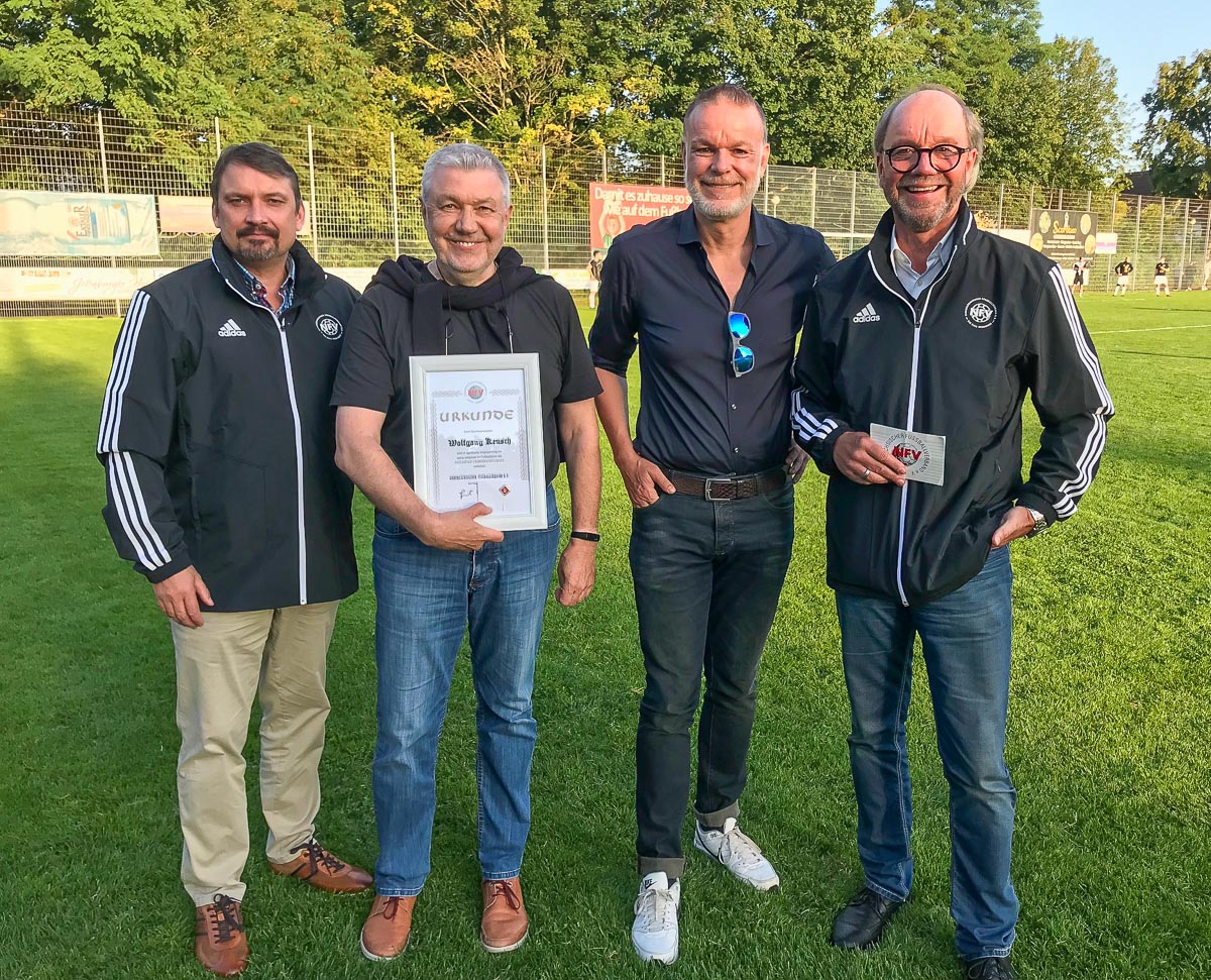 (Bückeburg) Wolfgang Keusch vom VfL Bückeburg erhielt mit der Goldenen Verdienstnadel des Niedersächsischen Fußballbundes aus den Händen des Kreisvorsitzenden Reinhard Stemme die höchste Auszeichnung.