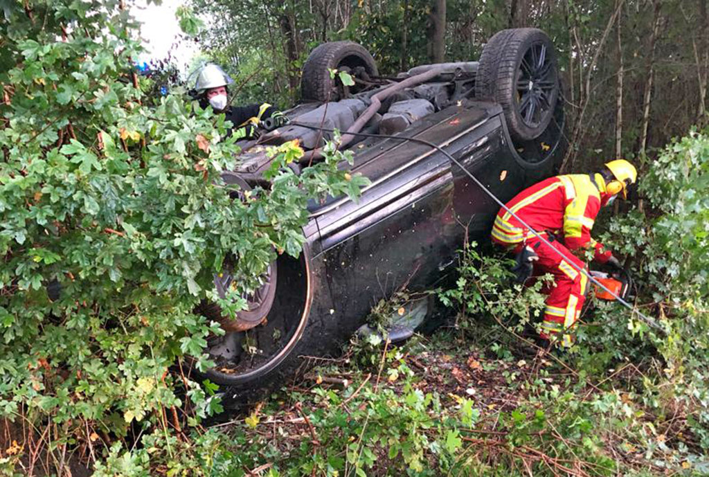 Anschließend durchfuhr der Wagen das dortige Buschwerk und überschlug sich. Auf dem Dach liegend fand er seine Endposition. Ein zunächst angeforderter Krankenwagen konnte die Unfallstelle unverrichteter Dinge verlassen, da beide Männer eine medizinische Versorgung nicht für nötig hielten.