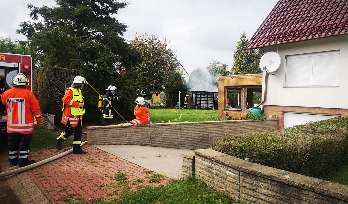 Vor Ort stellte sich für die Feuerwehr folgende Lage dar: Ein Gartenhaus mit einer Größe von circa zwei mal zwei Metern brannte in voller Ausdehnung. Das Feuer wurde mit zwei „C-Rohren“ bekämpft und die im Holz verborgenen Glutnester abgelöscht. Anschließend wurde das Brandobjekt mit einer Wärmebildkamera auf weitere Brand- und Glutnester kontrolliert.