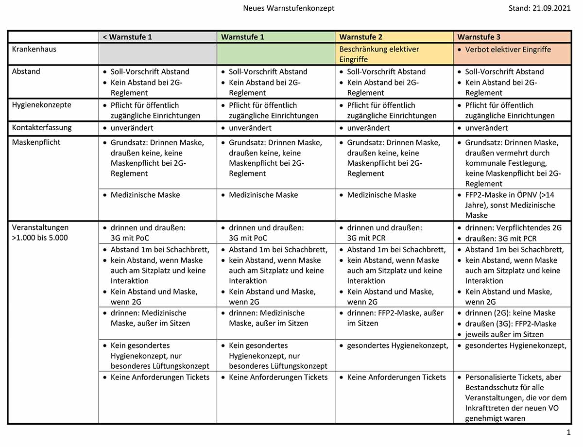 Darin werden die Indikatoren werden an die zwischenzeitlich erfolgten Veränderungen des Infektionsschutzgesetzes (IfSG) angepasst. Neuer Leitindikator wird dementsprechend die „Hospitalisierung“ (Neuaufnahmen). Die Warnstufen zwei und drei werden ausgestaltet. Erweitert werden die Möglichkeiten für Betreiber und Veranstalter freiwillig auf die „2G“-Regel (geimpft oder genesen) überzugehen. Das hat zur Folge, dass auf Abstand, Maske und zum Teil auch auf eine Kapazitätsbegrenzung verzichtet werden kann. In einigen Bereichen wird ab Warnstufe zwei oder Warnstufe drei die 2G-Regel sogar Pflicht.