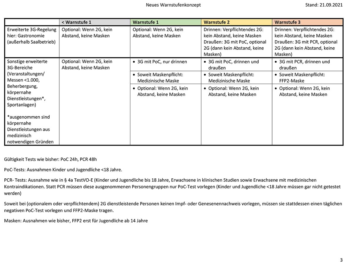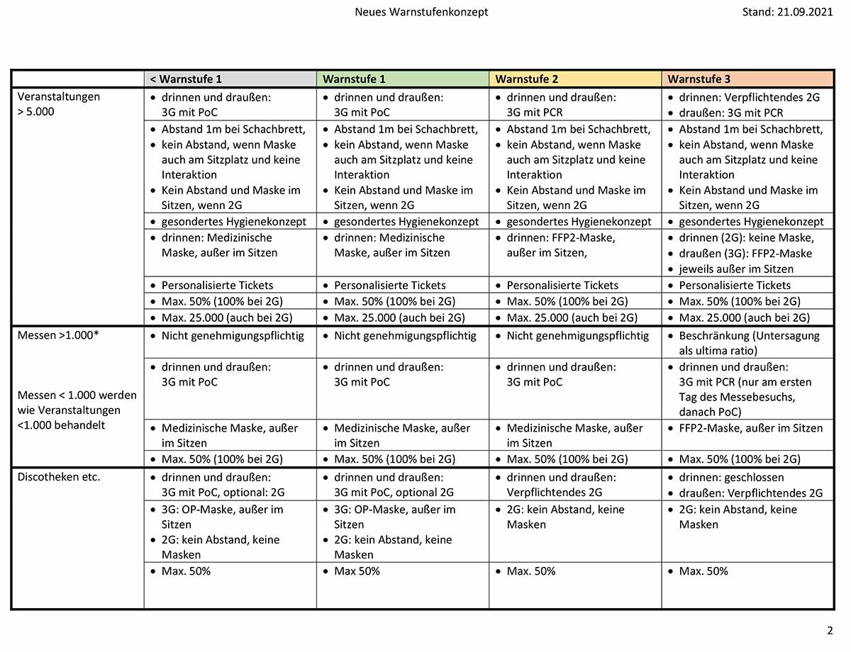 Bei größeren Veranstaltungen mit über 1.000 Teilnehmenden (§ 10) und bei Großveranstaltungen (über 5.000, siehe § 11) gilt bis einschließlich Warnstufe 1 drinnen und draußen 3G mit einem PoC Antigen-Test. Ab Warnstufe 2 gilt drinnen und draußen das verschärfte 3G. Alle nicht Genesenen und nicht vollständig Geimpften müssen dann statt eines negativen PoC-Tests einen negativen PCR-Test nachweisen. Ab Warnstufe 3 gilt drinnen dann ein obligatorisches 2G.