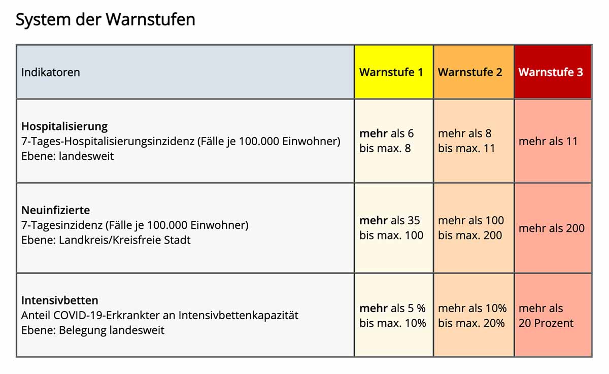 Eine Warnstufe kann, so § 3 der Verordnung, nur dann ausgerufen werden, wenn mindestens der Leitindikator Hospitalisierung die jeweiligen dargestellten Schwellenwerte über fünf Werktage hinweg überschritten hat. Hinzu muss dann die Überschreitung eines der anderen beiden Indikatoren kommen.