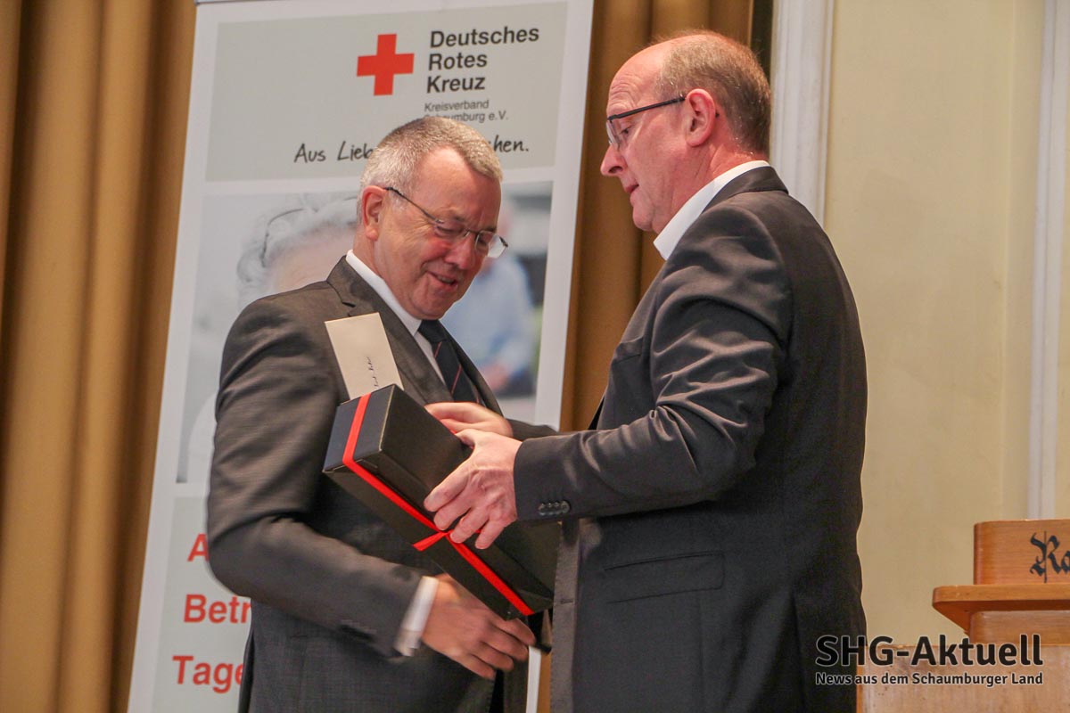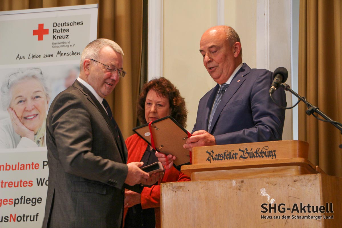 Koller hinterlässt große Fußstapfen, musste er doch in den vergangenen acht Jahren mehr als nur eine große Herausforderung gemeinsam mit dem DRK-Kreisverband Schaumburg schultern. Mit der Flüchtlingswelle 2015, der Corona-Pandemie in den vergangenen zwei Jahren und der Fluthilfe im Sommer im Westen Deutschlands meisterte das DRK unter Koller unerwartete Situation bravourös, wie auch Landrat Jörg Farr in seinem Grußwort attestierte. Dabei galt zum Abschied besonderer Dank dem Präsidenten: „Wir wussten, es gibt viele Aufgaben für dich beim DRK. Aber wie viel, hat niemand geahnt. Wir konnten uns immer auf dich verlassen, beispielsweise als ihr im September 2015 innerhalb eines halben Tages die Notunterkunft für Geflüchtete in Bückeburg bereit gemacht habt. Du hast viel bewegt und viel geholfen.“
