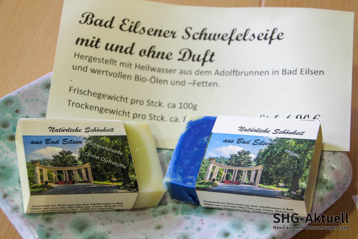 Seit Juli gibt es die Bad Eilsener Schwefelseife in der Tourist-Info käuflich zu erwerben, ebenso in der Bückeberg-Klinik, die eine direkte Standleitung von der Quelle hat. Auch die Bückeburger Tourist Information verkauft inzwischen die Seifen, die auf durchweg positive Resonanz stoßen. „Damit hätten wir nie zu hoffen gewagt. Ein tolles Zeugs“, freut sich auch Elke Dralle. Dabei gibt es die guten Stücke in zwei Varianten: weiß-blau und mit ansprechendem Limonenduft, oder aber schlicht weiß und ohne jegliche Duftstoffe. Generell befinden sich keinerlei synthetische Duft-, Farb- oder Konservierungsstoffe in den Seifen, lediglich das Quellwasser und Bio-Zutaten wie Oliven-, Kokos- und Rapsöl kommen hinein. Hergestellt werden die Seifen zwar mit Bad Eilsener Schwefelwasser, aber zugegebenermaßen werden sie nicht in Bad Eilsen, sondern in Barsinghausen von Tanja Claußen gefertigt. Der Kontakt zu Claußen kam auf dem beliebten Bad Eilsener Bauernmarkt zustande, wo sie regelmäßig handgefertigte Seifen verkauft.