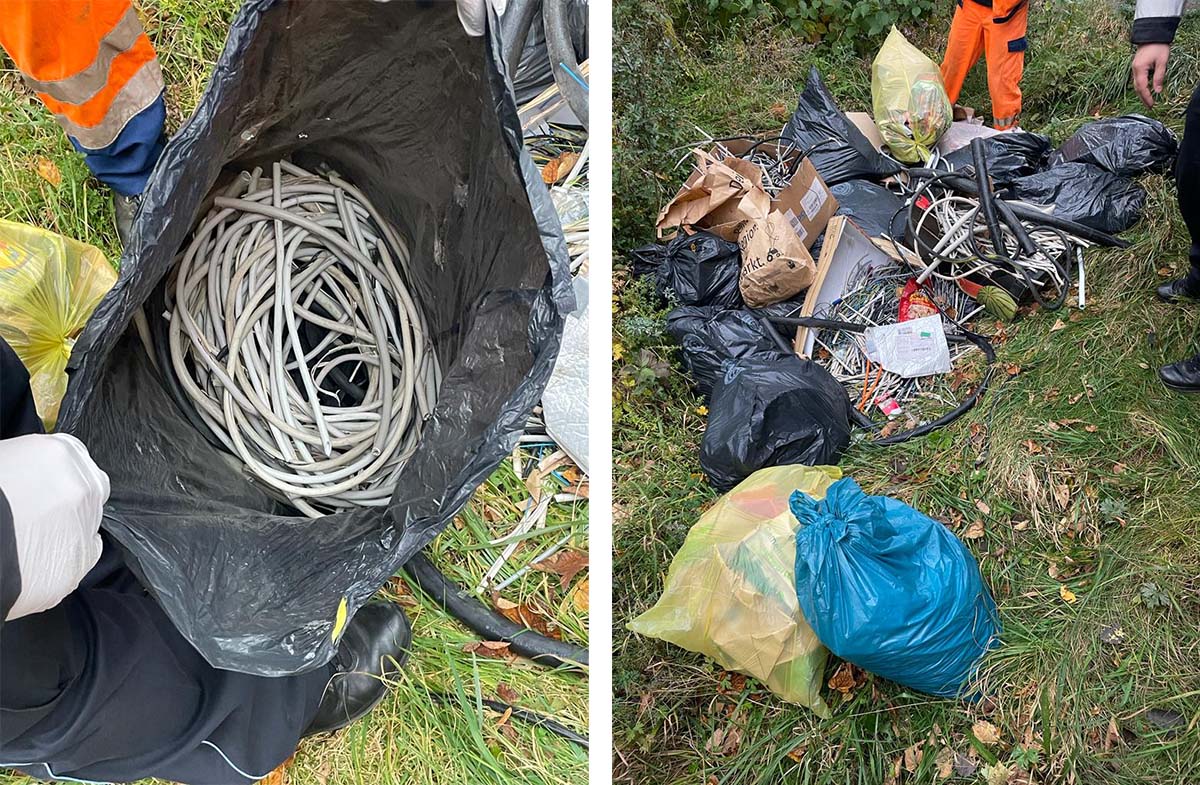Ein Zeuge entdeckte am Mittwoch gegen 09.00 Uhr im Straßengraben 20 hineingeworfene Müllsäcke bzw. Verpackungen mit überwiegend Kabelmaterial und Hausmüll. (po/Foto: Polizei)