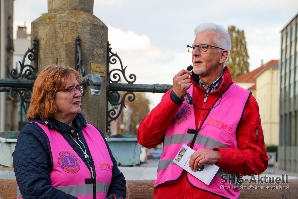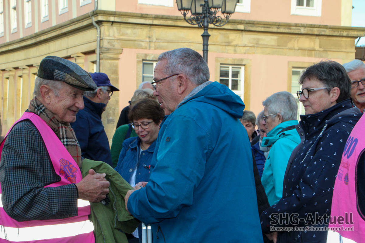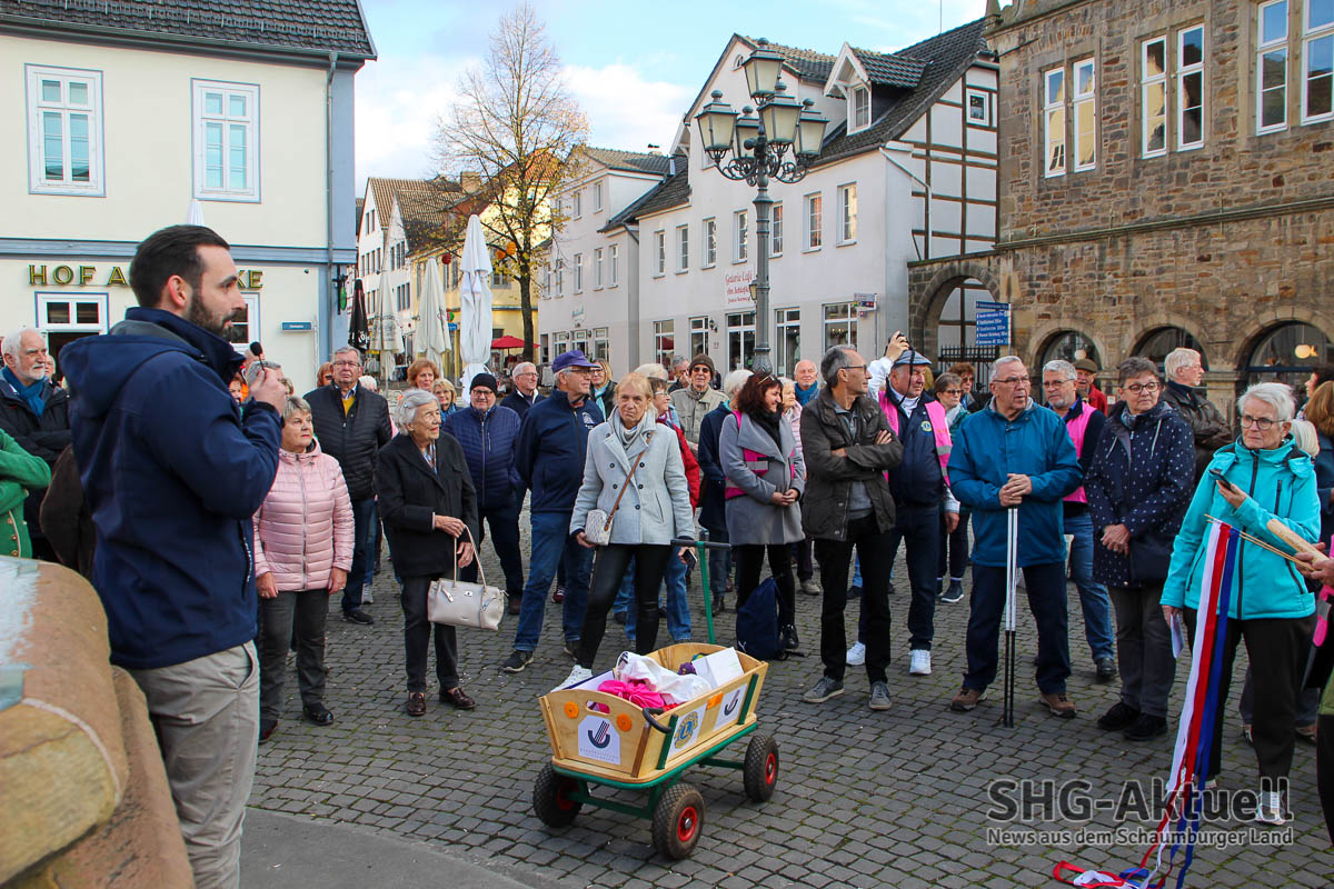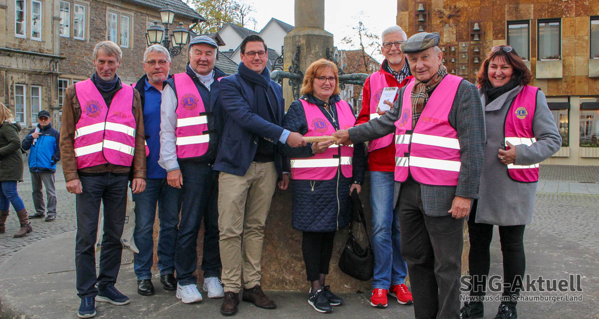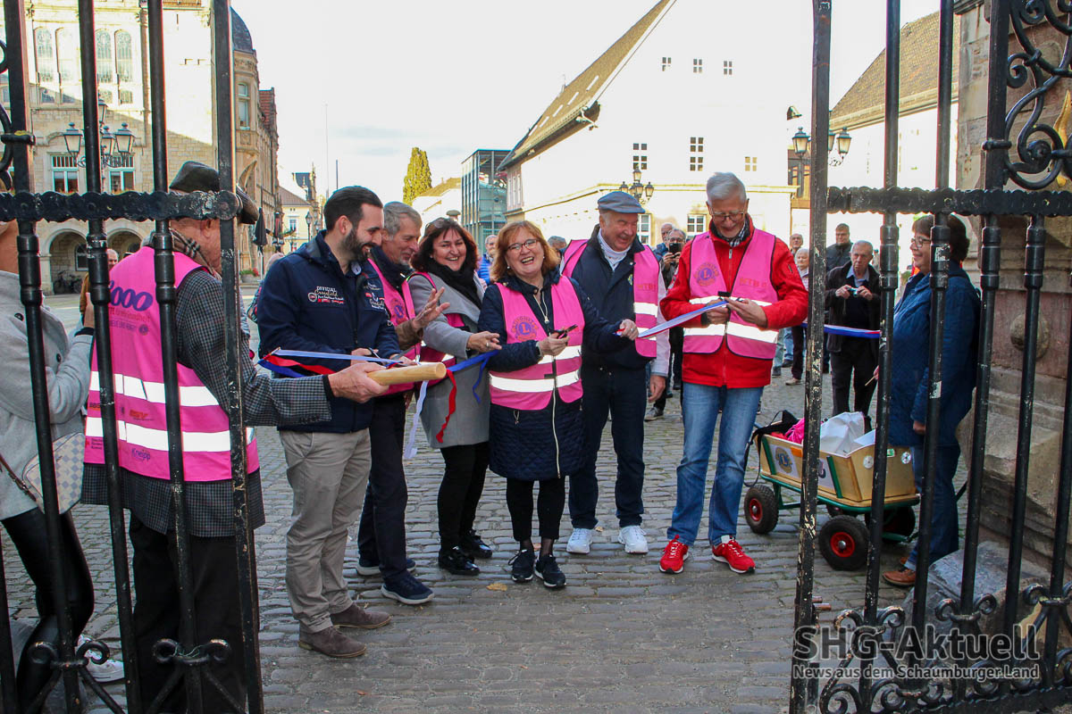Zum Auftakt hatten sich neben den Protagonisten vom Lions Club Bad Eilsen und Porta Westfalica auch Akteure der Lions aus Einbeck, Hameln und Buxtehude, die ebenfalls seit längerem das Projekt in ihrer Stadt realisieren. Rosa Huppert, Initiatorin des Projektes, war überwältigt über die große Resonanz und das immense Interesse. Neu-Bürgermeister Axel Wohlgemuth lies sich eine Stippvisite auf dem Marktplatz nicht nehmen und wünschte „viel Spaß und schöne Farben“ beim Spaziergang und versprach, das nächste Mal mit von der Partie zu sein. „Wir fördern bürgerliches Engagement und unterstützen daher gerne die Aktion. Schön, dass Sie alle da sind und vielen Dank an Anke Milost für die Organisation in Bückeburg, Blindow und den Schülern für ihren Einsatz, dem DRK für seine unterstützende Begleitung sowie Dr. Barbara Zimmermann von Hochschule 21, die dafür sorgen, dass die Bewegungsbegleiter auch richtig ausgebildet werden. Aber genug geredet, Sie sind ja hier um zu laufen“, so Friedrich Schütte, Vorsitzender der Bürgerstiftung Schaumburg.