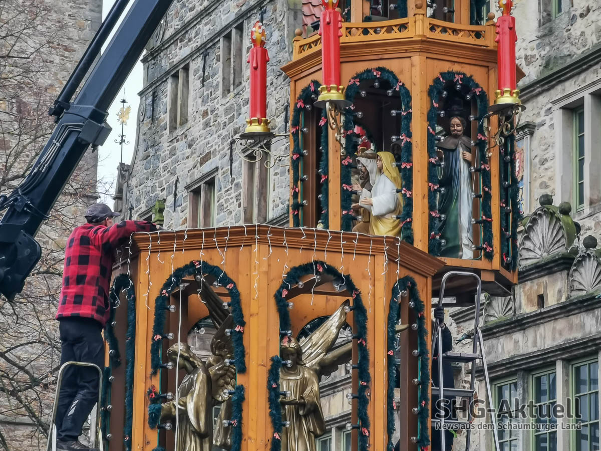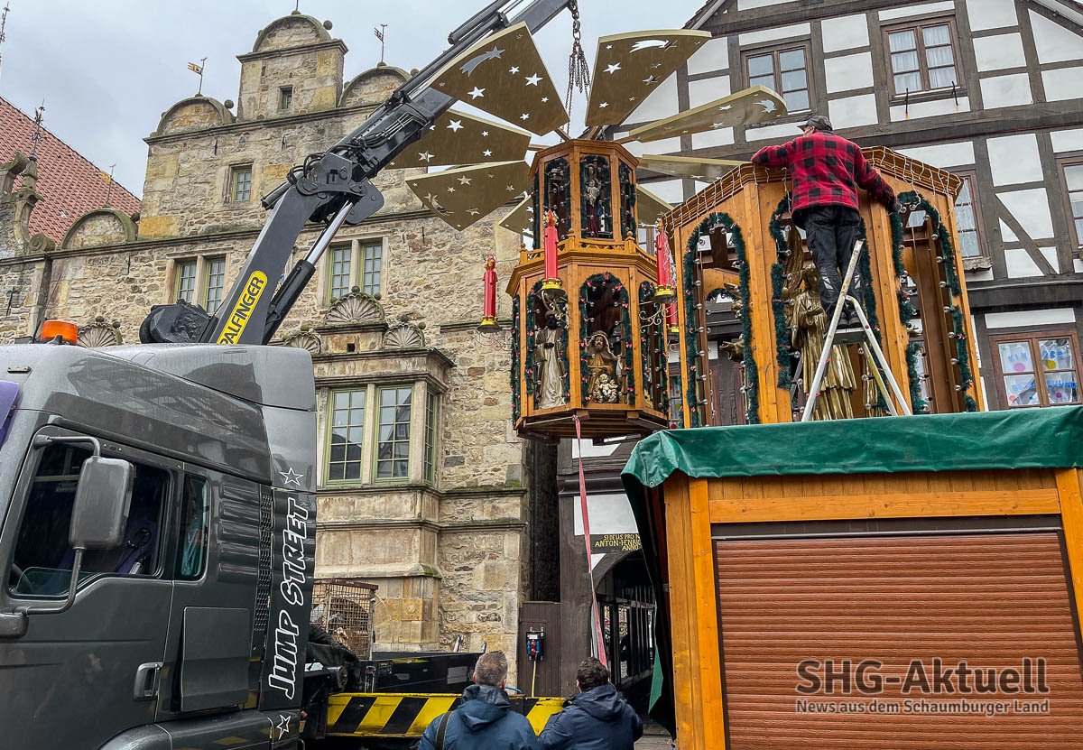 (Rinteln) Es hat schon eine gewisse Symbolik, wenn der LKW-Motor um fünf Minuten vor 12 Uhr mittags aufbrummt und die Spitze der Rintelner Weihnachtspyramide auf den Unterbau setzt.
