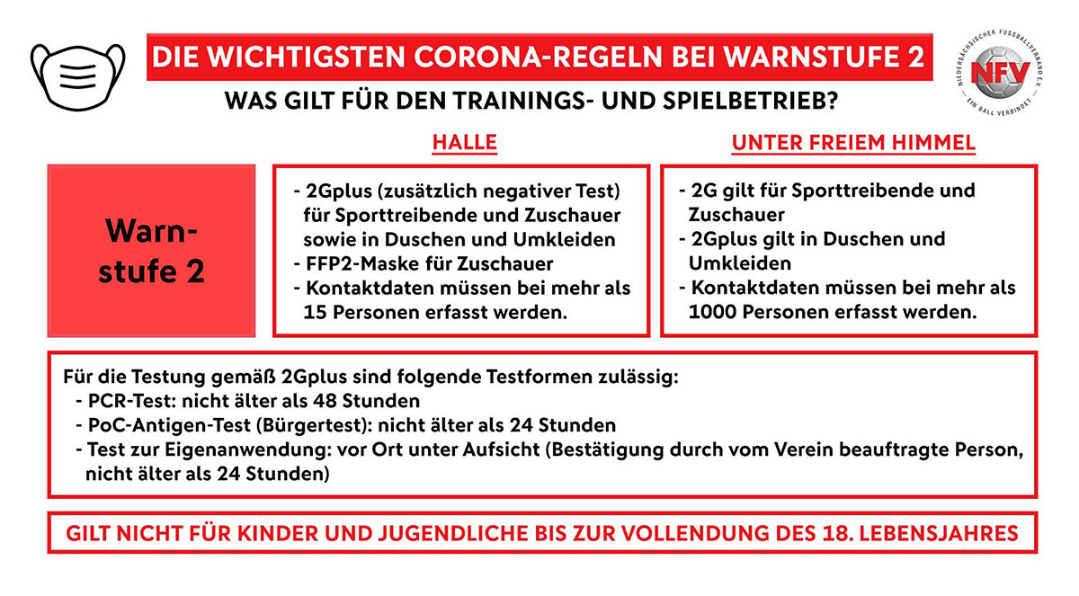 Für Kinder und Jugendliche bis zur Vollendung des 18. Lebensjahres (bis einschließlich 17 Jahre) gilt die 3G-, 2G- bzw. 2G+-Regel nicht. Auch nach Feststellung der Warnstufe 2 besteht die Möglichkeit, Fußballspiele auszutragen. Vor dem Hintergrund des nachweislich geringen Infektionsrisikos an der frischen Luft hat sich der Niedersächsische Fußballverband deshalb für die mögliche Fortführung des Spielbetriebes im Freien – unter Einhaltung aller Hygienevorgaben – entschieden. Gleichzeitig haben jedoch die Kreis- und Bezirksgliederungen des NFV die Möglichkeit, auf die sich ändernden Rahmenbedingungen zu reagieren, Spiele (ggf. flächendeckend) abzusetzen und in Absprache mit den beteiligten Vereinen in das kommende Kalenderjahr zu verlegen. In diesem Fall sollen keine Verwaltungsgebühren erhoben werden.