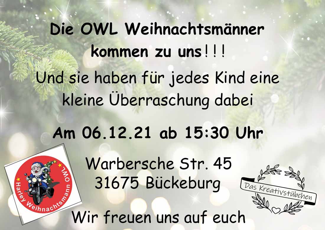 (Warber) Am Nikolaustag, am Montag den 6. Dezember, statten die Harley-Weihnachtsmänner OWL dem „Kreativstübchen“ an der Warberschen Straße 45 einen Besuch ab.