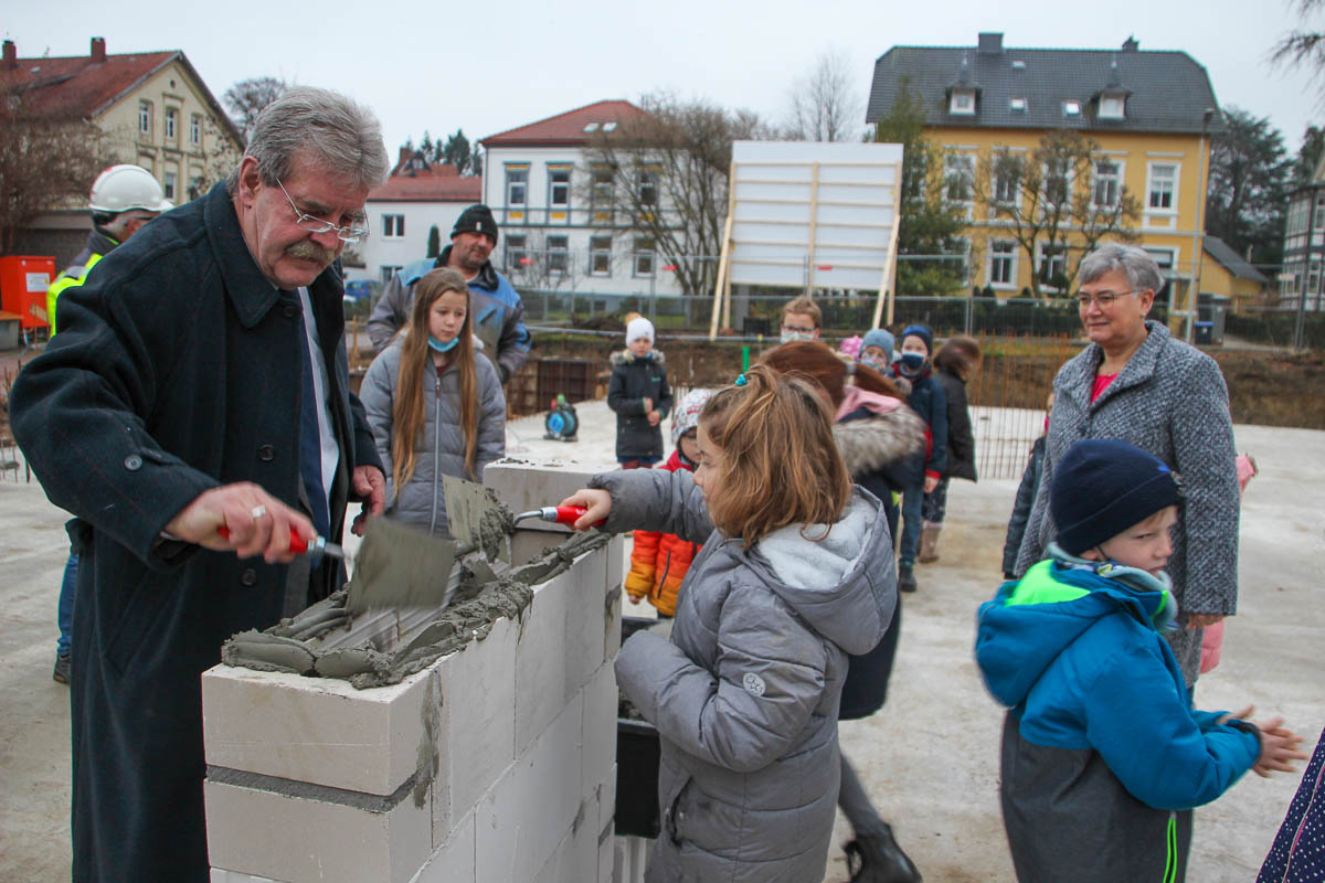 Hierfür waren nicht nur Vertreter der Verwaltung und der beteiligten Baufirmen zugehen, auch Schulleiterin Antje Kronenberg und ihre Schüler hatten etwas vorbereitet, um es in die Zeitkapsel zu geben, die in den Bau eingemauert werden solle. Die Schüler hatten kleine Briefe geschrieben, in denen sie der Nachwelt berichten, wie der Schulalltag aussieht, wie die Pandemie diesen beeinflusst und wie sie sich die Zukunft vorstellen. Die Schüler der ersten und zweiten Klassen hatten zudem tolle Bilder gemalt, um sie für die Nachwelt zu bewahren.