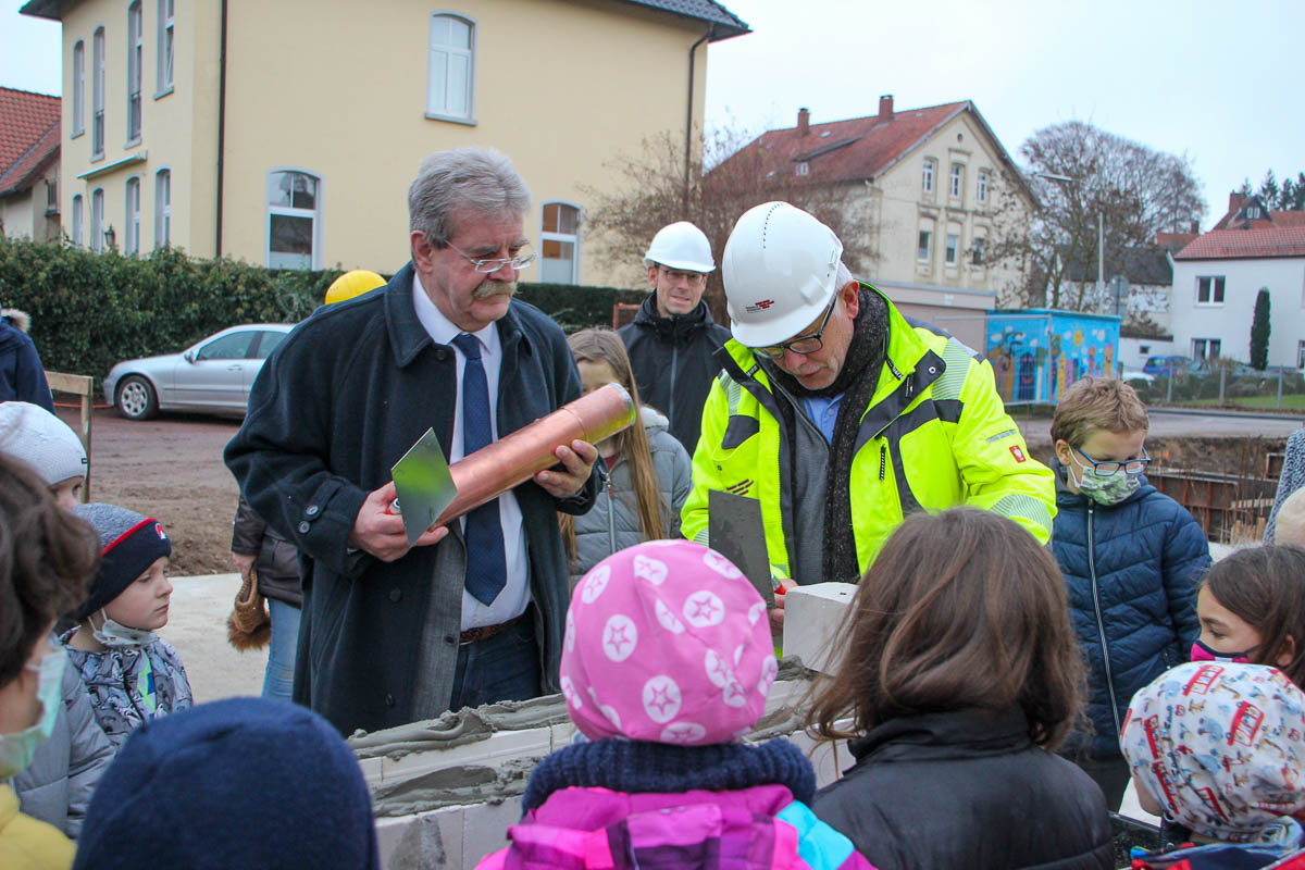 Christian Schütte, Fachgebietsleitung Familie und Soziales, sorgte gewissenhaft dafür, dass alle diese Werke, gemeinsam mit einer Zeitung, den Weg in die Zeitkapsel fanden. Peter Kohlmann, stellvertretender Bürgermeister der Stadt Bückeburg, richtete das Wort an die Anwesenden: „Ein besonderer Tag für die Stadt und für die Grundschule, denn heute legen wir den Grundstein für die Sanierung und Erweiterung eines zukunftgerichteten Lernortes. Danke an alle, die sich für dieses anspruchsvolle Projekt eingesetzt haben, das uns noch einige Jahre begleiten wird.“ Der Neubau wird neben der Mensa noch weitere Räume, unter anderem für den Jugendchor, enthalten und soll im kommenden Jahr fertiggestellt werden. Dann geht es am Hauptgebäude mit der Dachsanierung und dem sukzessiven Ausbau der einzelnen Geschosse weiter. 2025 soll die Sanierung abgeschlossen sein.