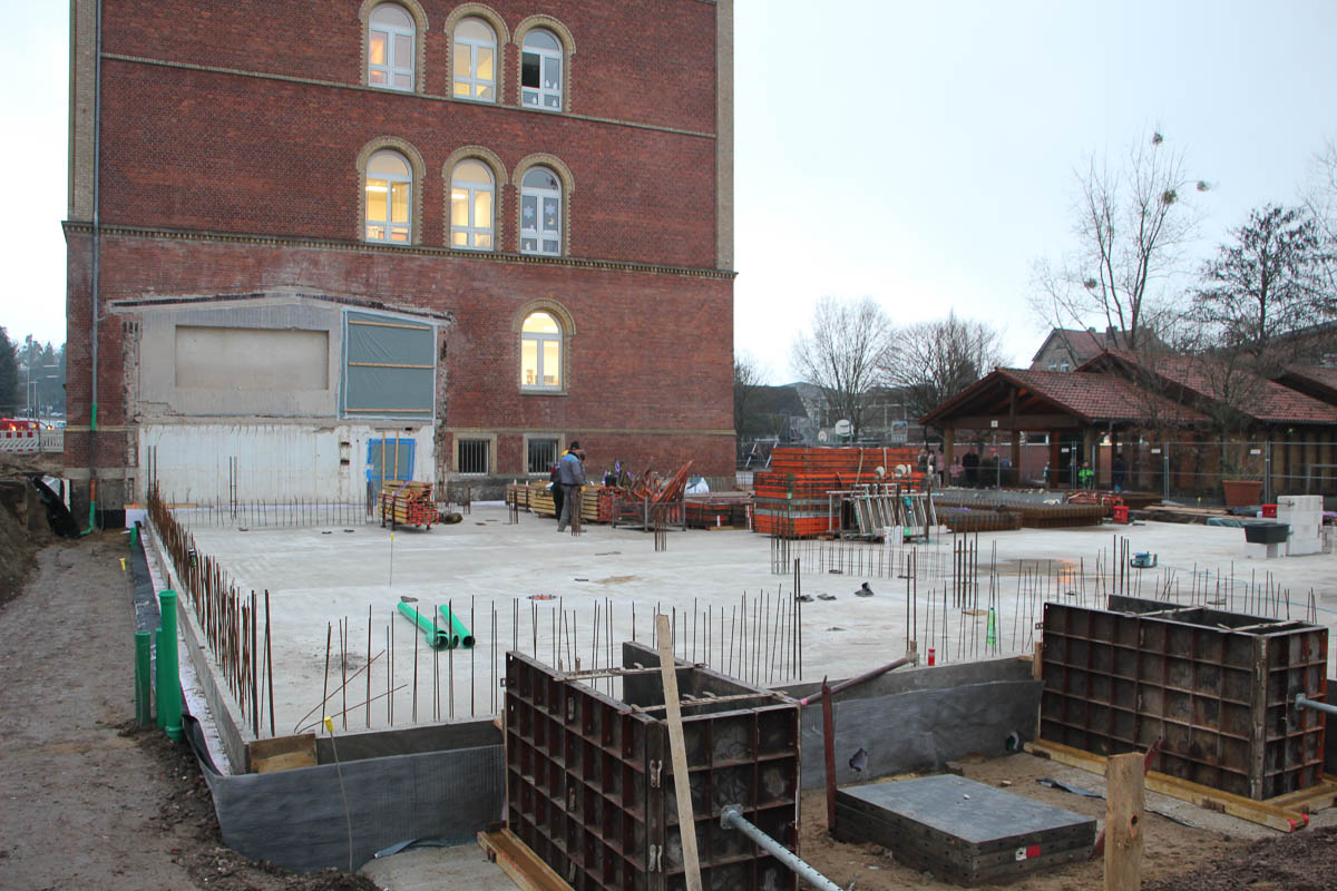 Im Zuge der umfangreichen Sanierung der gesamten Schule wird hier die neue Mensa entstehen. Die Bodenplatte dafür liegt bereits, nun war es an der Zeit, den Grundstein für das neue Gebäude im feierlichen Rahmen zu legen.