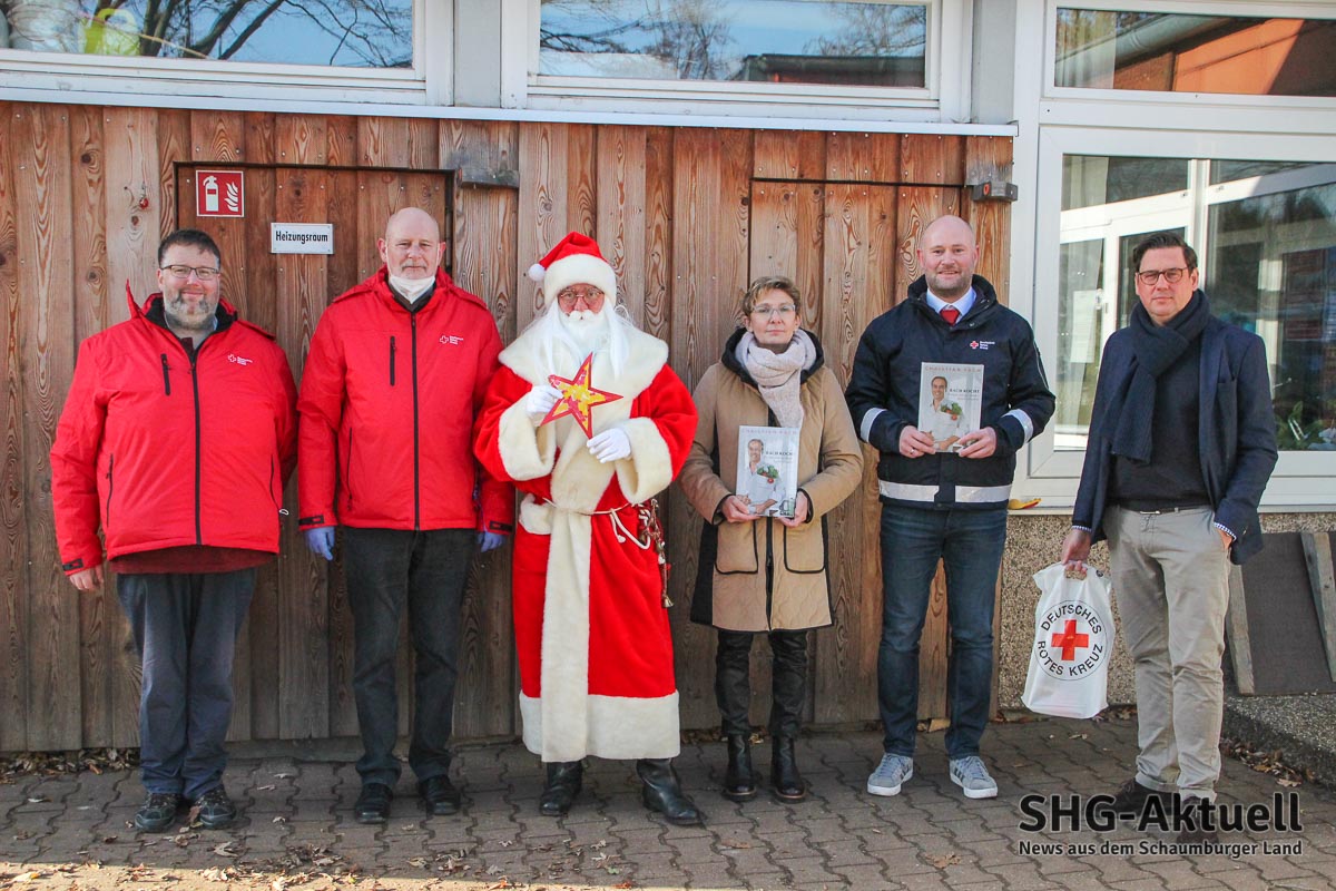 Tumultartig scharten sich die Kinder in der städtischen Kindertagesstätte Unterwallweg um Sven Lampe, dem Vorsitzenden des Bückeburger DRK, den Weihnachtsmann und Peter Lampe sowie Andreas Biere vom Sozialkreis des Roten Kreuzes. Mit dabei hatten die Rotkreuzler für jedes Kind eine vollbepackte Tüte, gefüllt mit einem Bastelbogen für einen Krankenwagen, Playmobil beziehungsweise für die unter Dreijährigen Seifenblasen, Schokolade, einem Pixi-Buch zur Ersten Hilfe sowie Kinderpflastern.