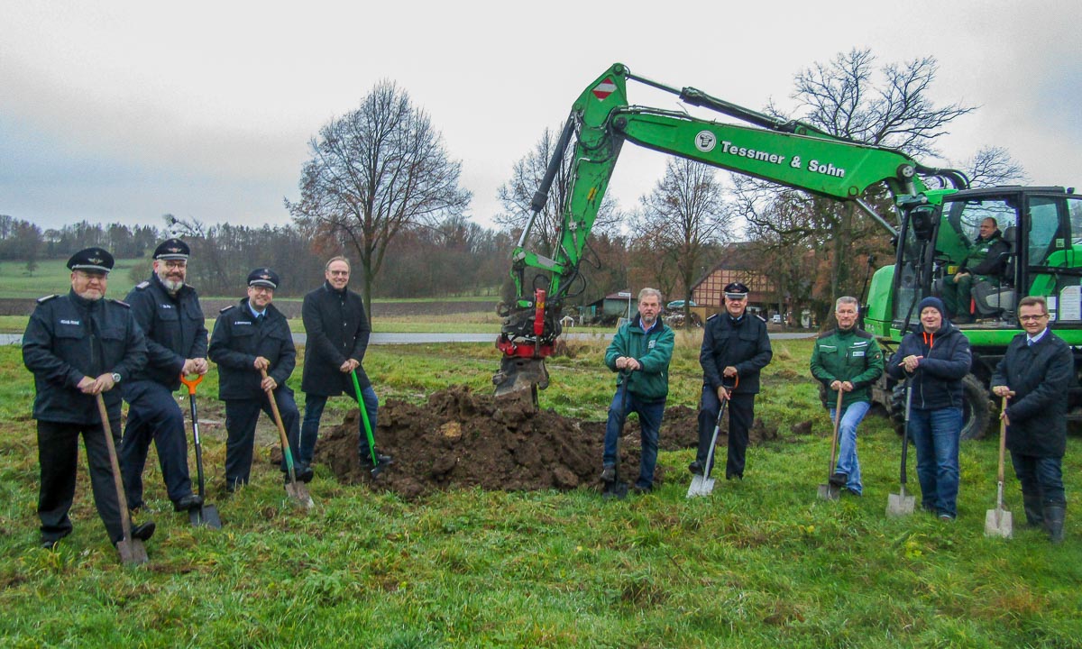 Vertreter der Feuerwehren, Politik, Verwaltung und der beauftragten Bau- und Planungsfirmen, trafen sich zum Spatenstich für das künftige Feuerwehrhaus der Ortswehren Bergkirchen, Wiedenbrügge-Schmalenbruch und Wölpinghausen.