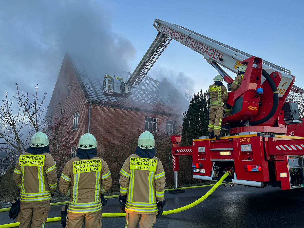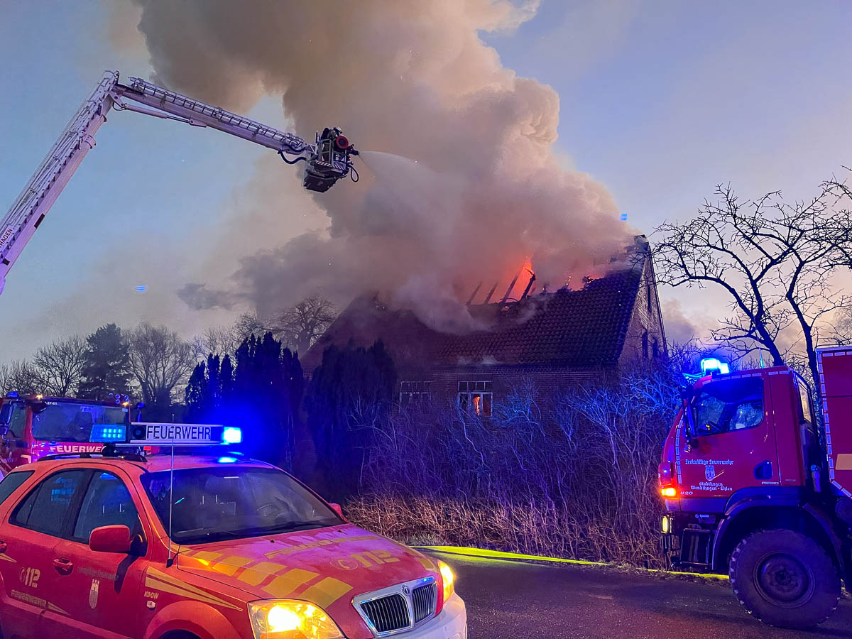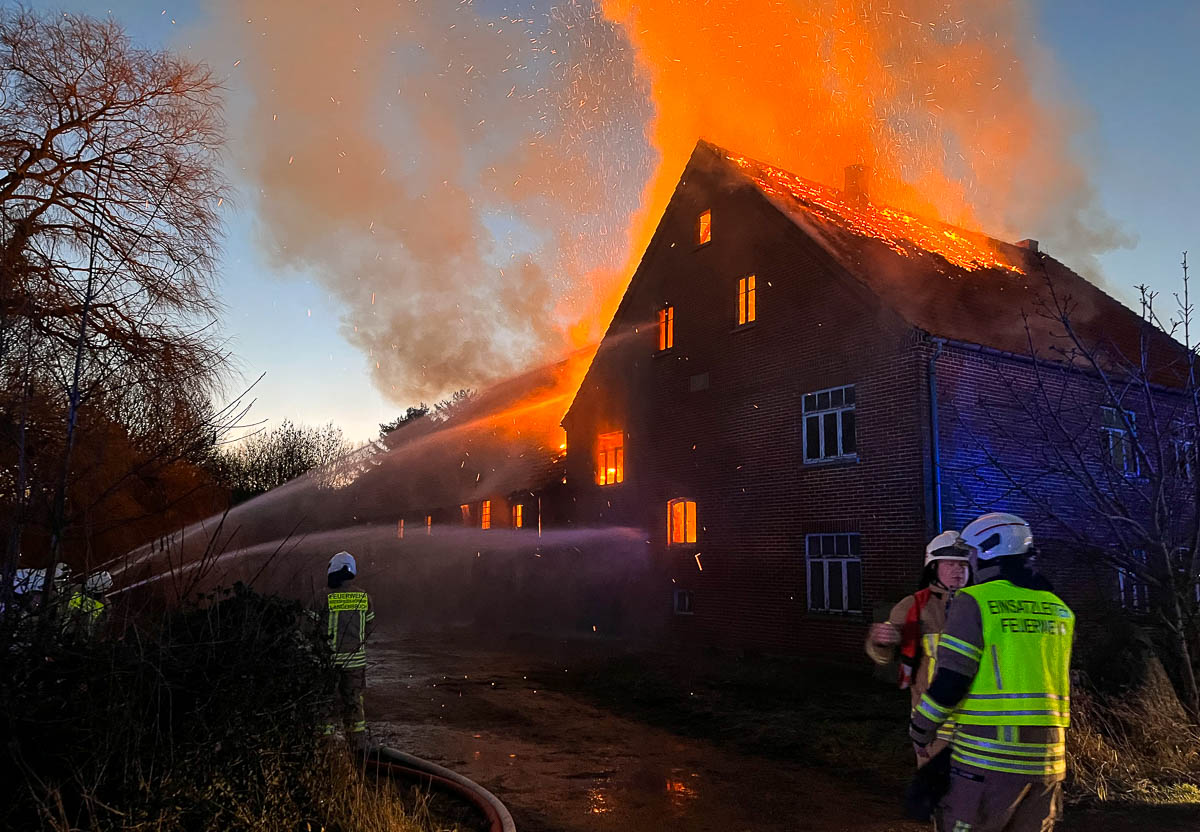 Als die ersten Kräfte vor Ort eintrafen, schlugen bereits Flammen aus einem Fenster im ersten Obergeschoss. Diese haben zügig auf das gesamte Gebäude übergegriffen. Der ausgedehnte Dachstuhlbrand war bereits von Weitem zu sehen. Es handelte sich laut Feuerwehrangaben um ein zum Glück leerstehendes, landwirtschaftliches Gebäude.