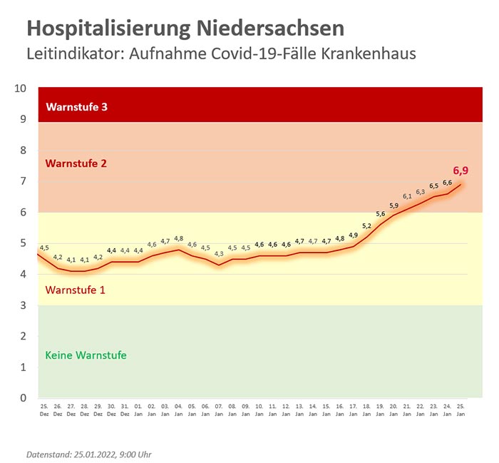 - die landesweite 7-Tages-Hospitalisierungsinzidenz (Neuaufnahmen COVID-19 Patienten) bei 6,9;