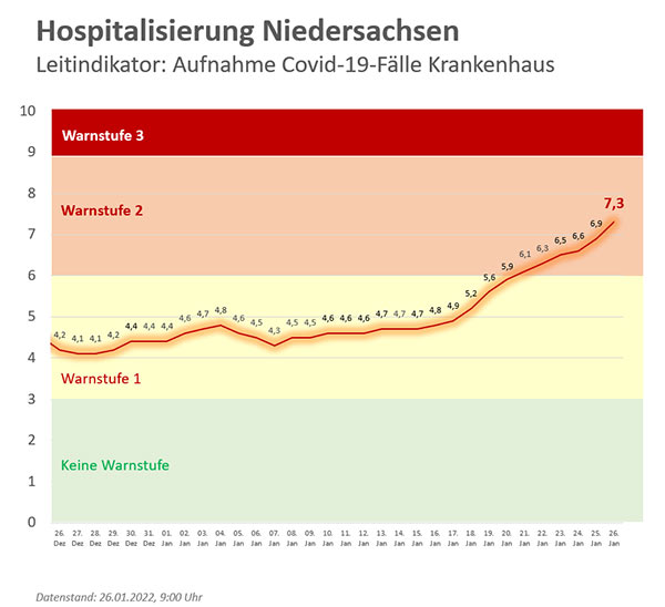 - die landesweite 7-Tages-Hospitalisierungsinzidenz (Neuaufnahmen COVID-19 Patienten) bei 7,3;