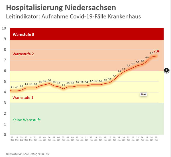 - die landesweite 7-Tages-Hospitalisierungsinzidenz (Neuaufnahmen COVID-19 Patienten) bei 7,4;