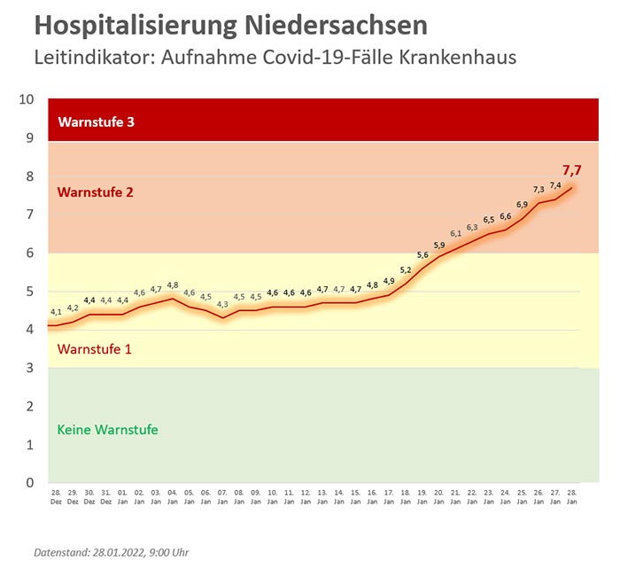 - die landesweite 7-Tages-Hospitalisierungsinzidenz (Neuaufnahmen COVID-19 Patienten) bei 7,7;